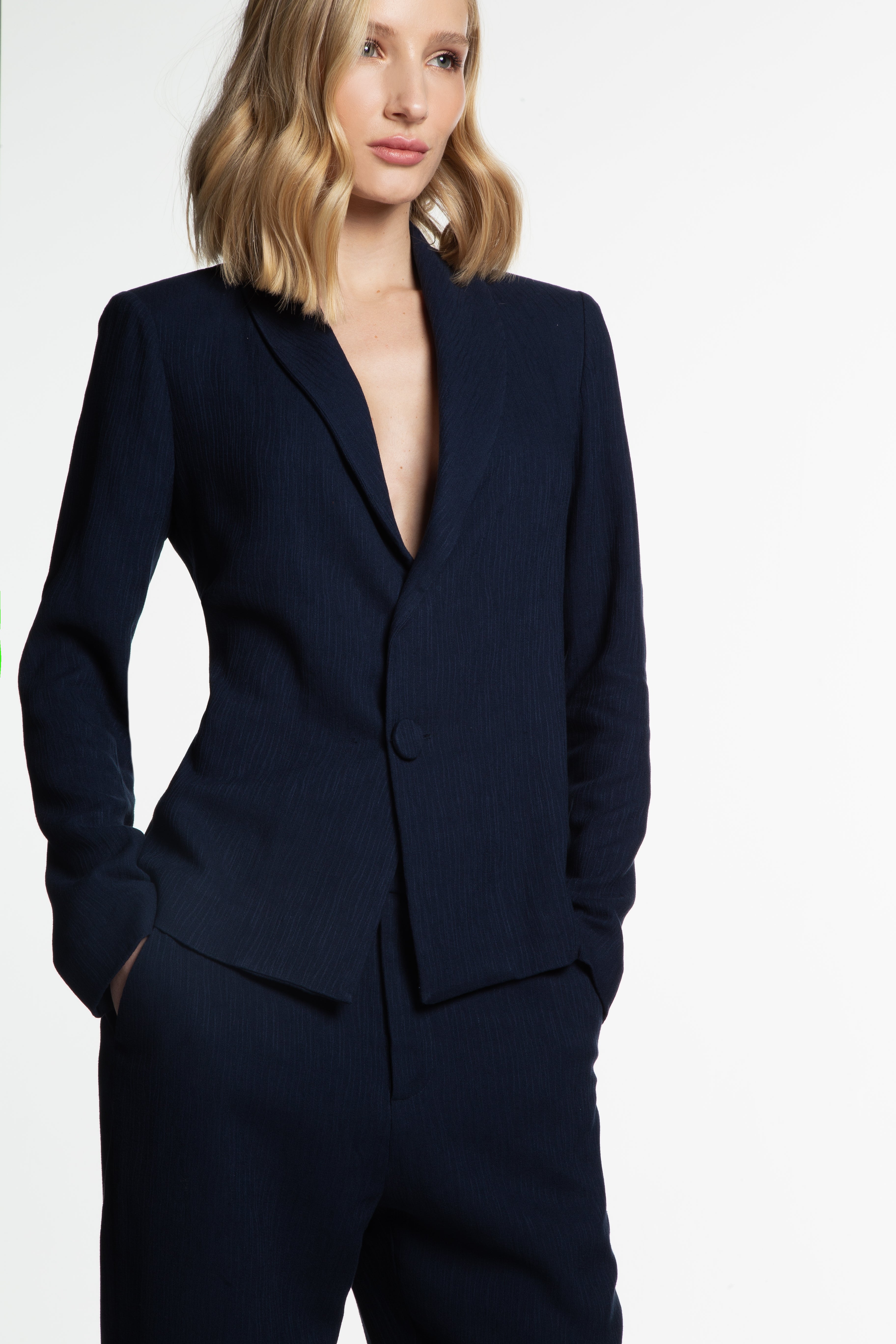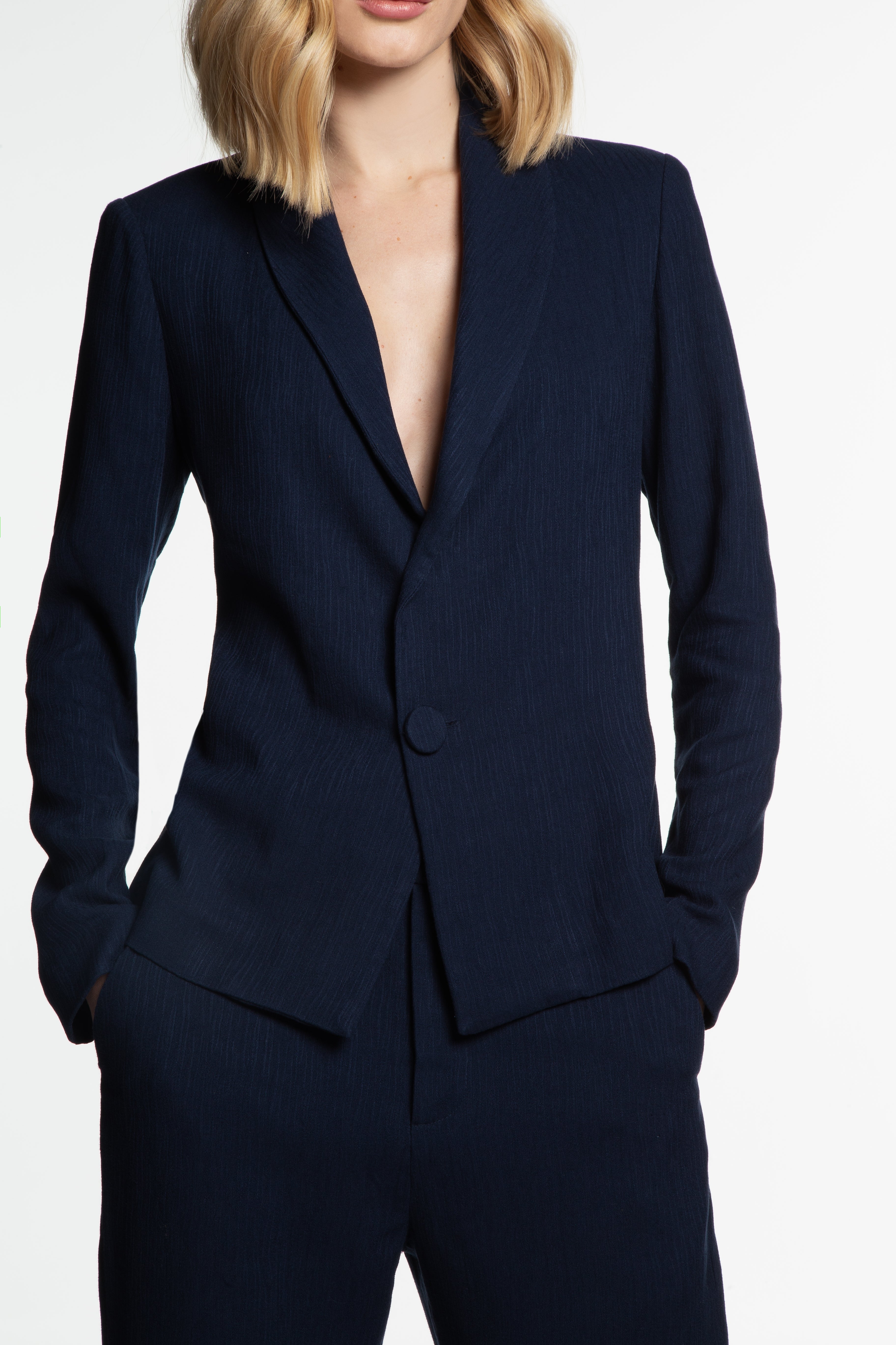 Peça de modelagem relaxed, o Blazer Noturna tem caimento perfeito e é super confortável. A peça, que possui uma gola xale e fechamento único frontal, é fabricada em tecido de viscose texturizada e seu acabamento interno é coberto por viés acetinado. O produto não possui forro.