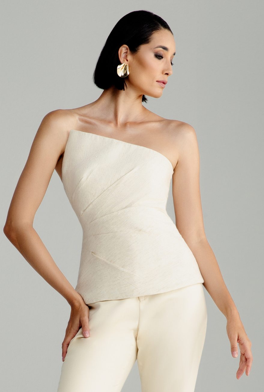Icônica por natureza, a Blusa Pétalas é uma peça estruturada e de design escultural. É fabricada em tecido de jacquard importado com delicada padronagem de cashmeres e composta por fibras de cânhamo, viscose e linho. Sua modelagem possui decote tomara que caia assimétrico, pregas na lateral e fechamento por zíper.