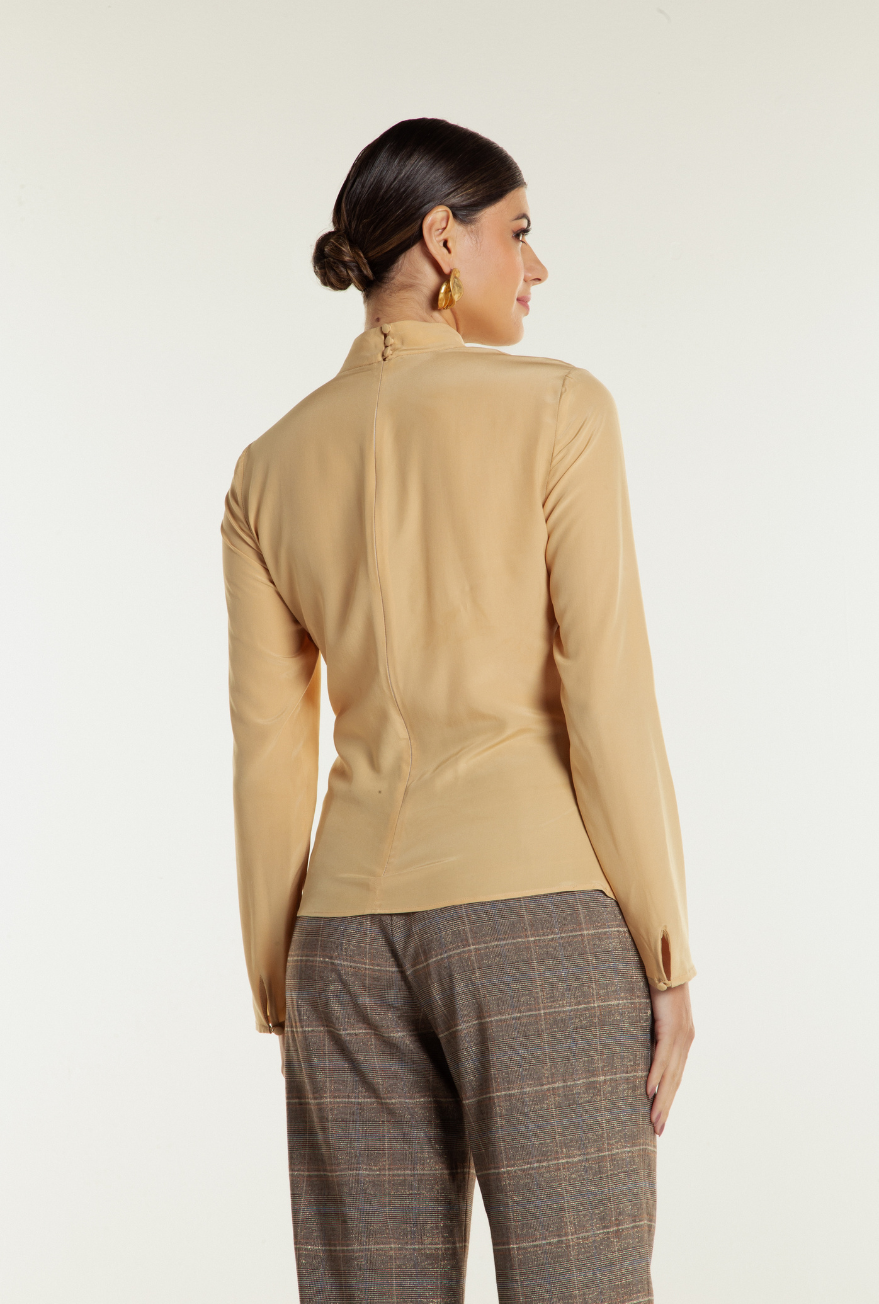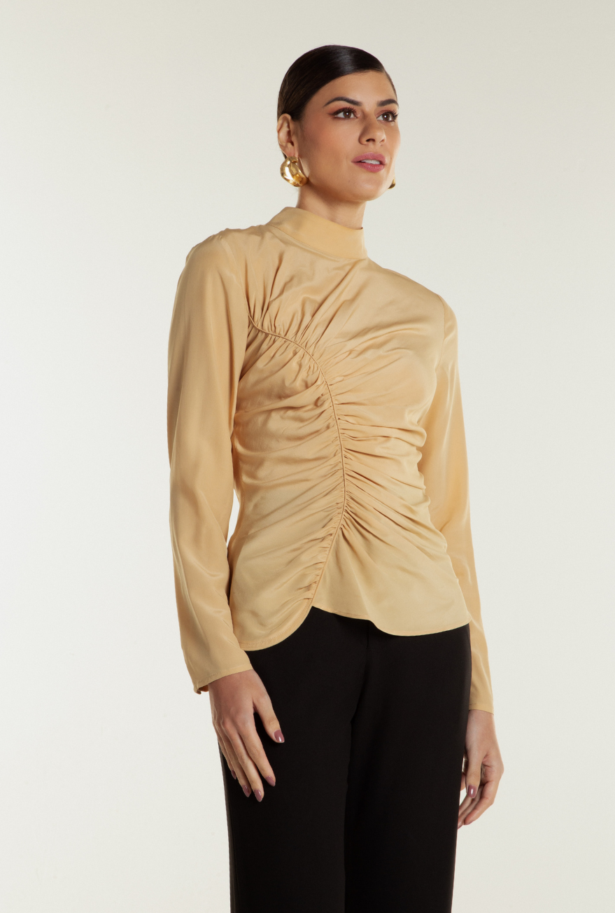 Blusa de manga longa com franzidos. Confeccionada em Crepe de Chine Manopesca de seda pura, possui toque aveludado e aparência stonada. Com um recorte arredondado e franzido na frente, fechamento por botão e zíper nas costas, essa blusa adiciona uma rica textura à composição dos visuais.