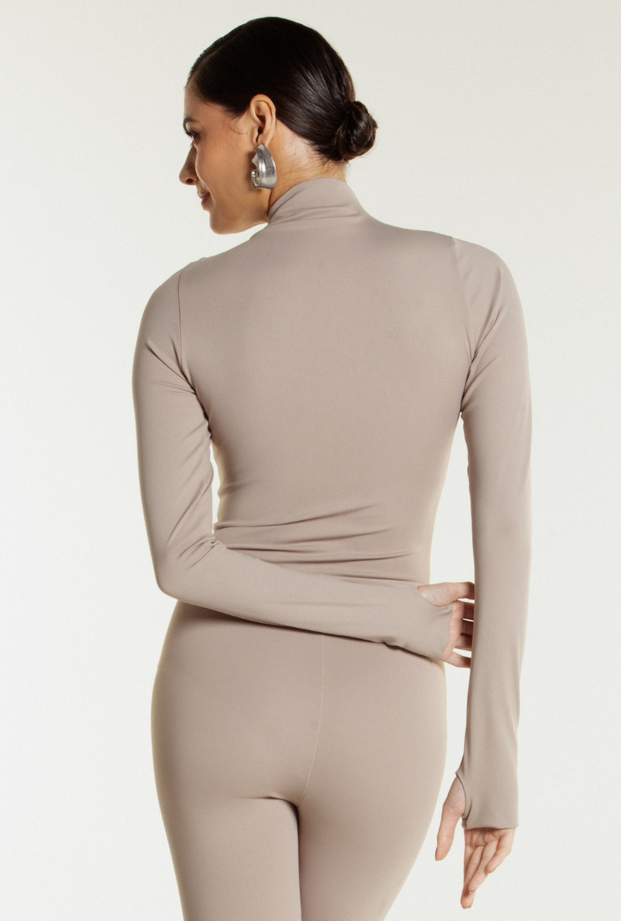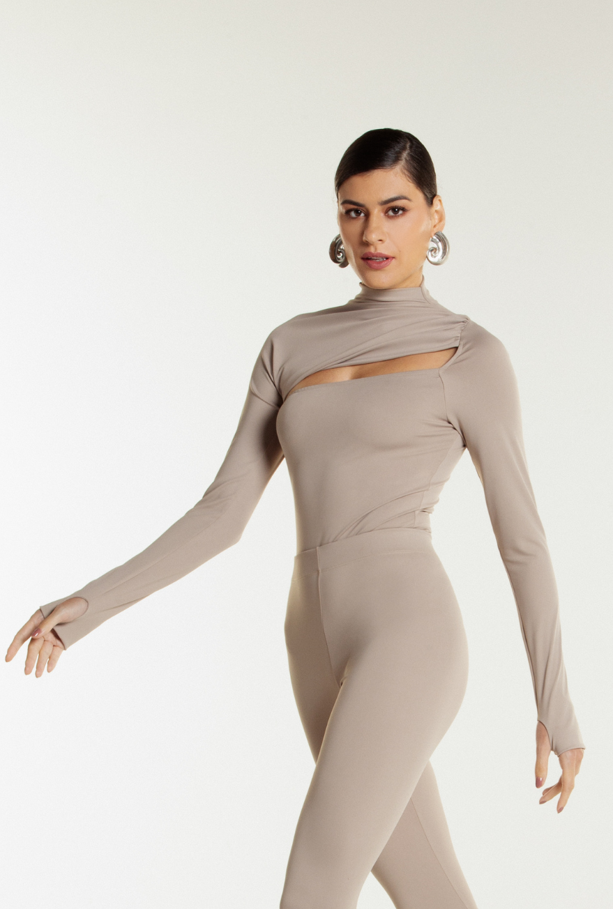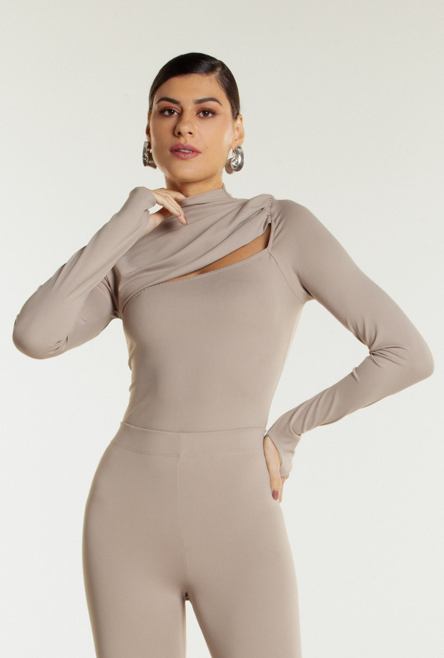 Body de mangas compridas em malha elástica. Possui franzidos e recorte assimétrico na frente, além da dedeira nas mangas para um visual moderno e arrojado. Fabricada em malha de poliamida biodegradável e elastano, não fica transparente e se adapta ao corpo muito facilmente. Possui toque macio e suave, tem proteção UV 50+ e certificação de controle de emissão de CO2, além do certificado OEKO-TEX standard 100.