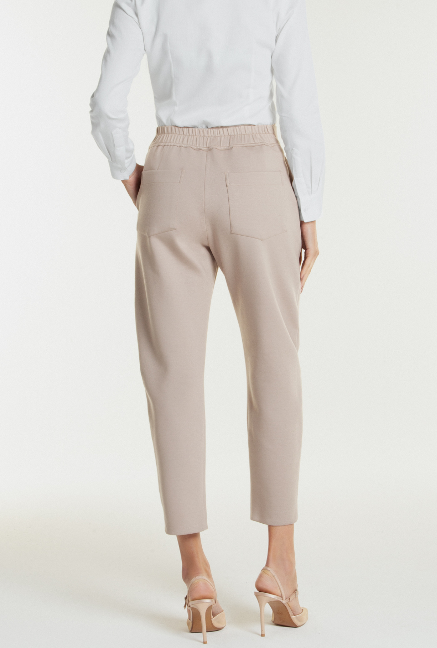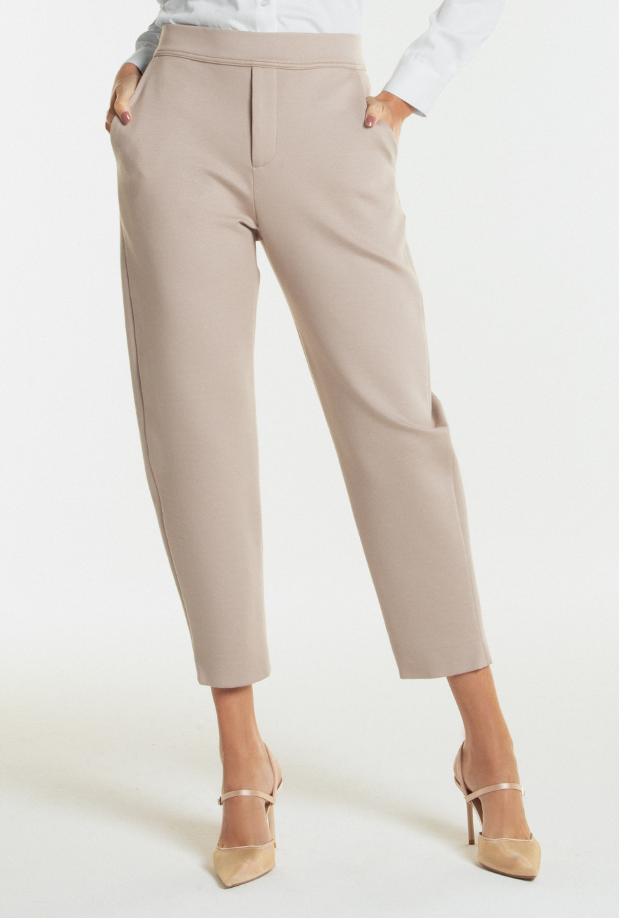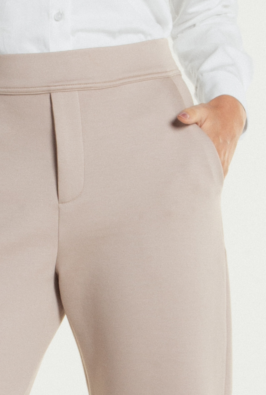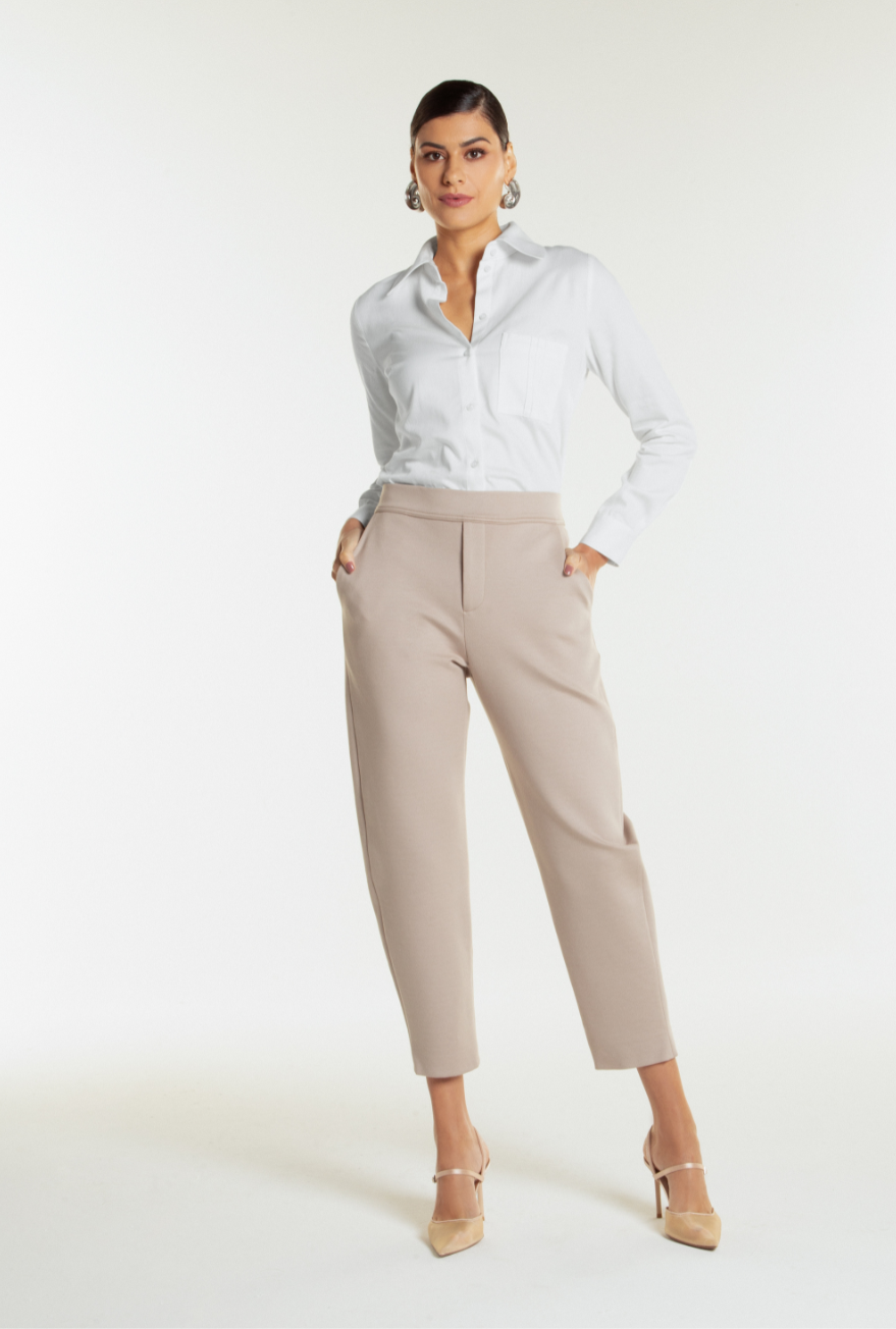 Calça de alfaiataria em malha. Fabricada em malha encorpada e pesada, possui tecnologia de controle de emissão de Co2 e certificado OEKO-TEX standard 100. Seu toque é macio e sedoso, com modelagem inspirada em alfaiataria. Seu shape levemente arredondado constrói uma silhueta cool e moderna, podendo ser combinada com peças mais arrumadas ou despojadas, trazendo versatilidade na proposta de visual. Possui cós elástico nas costas e acabamento de bainha invisível realizado à mão.
