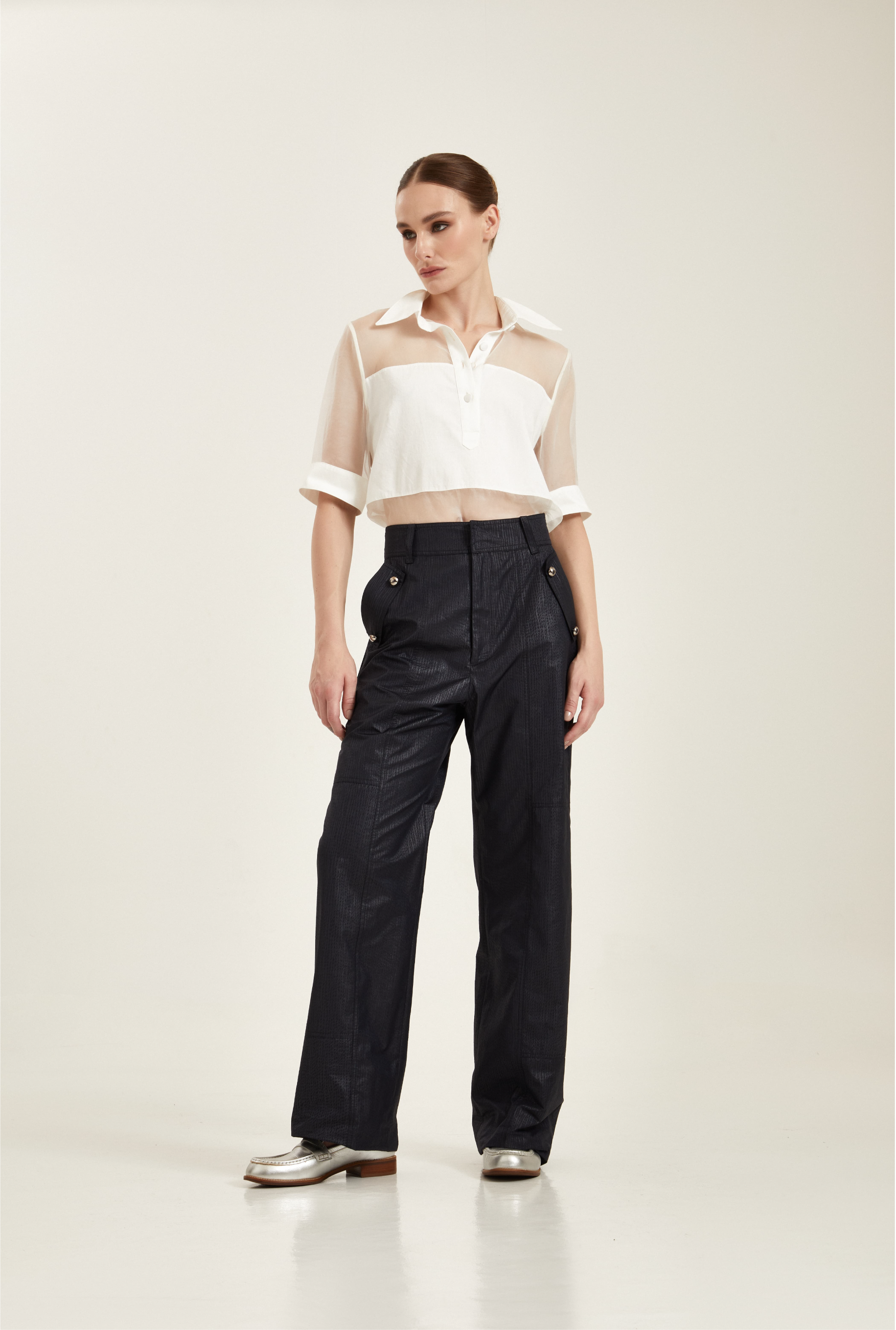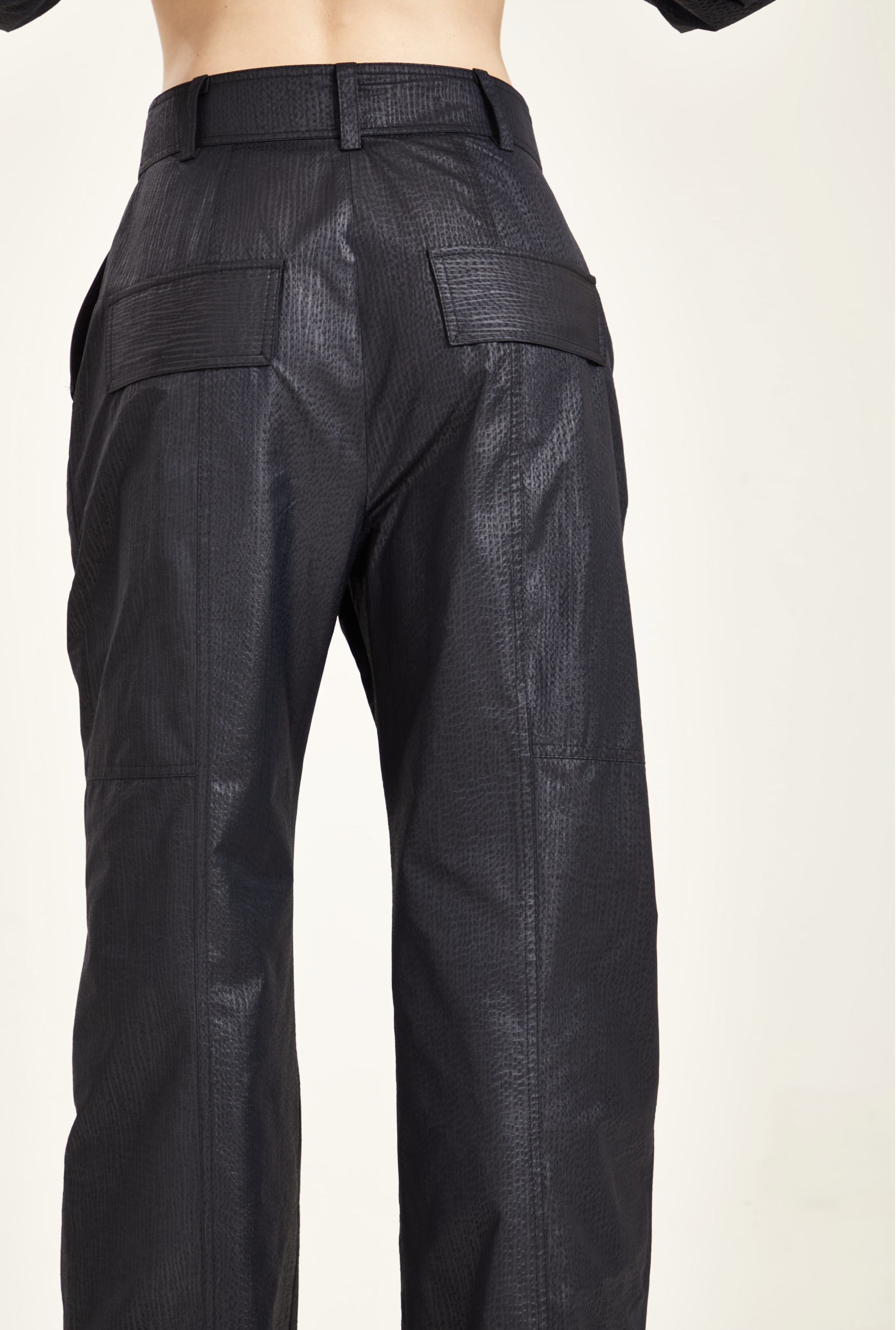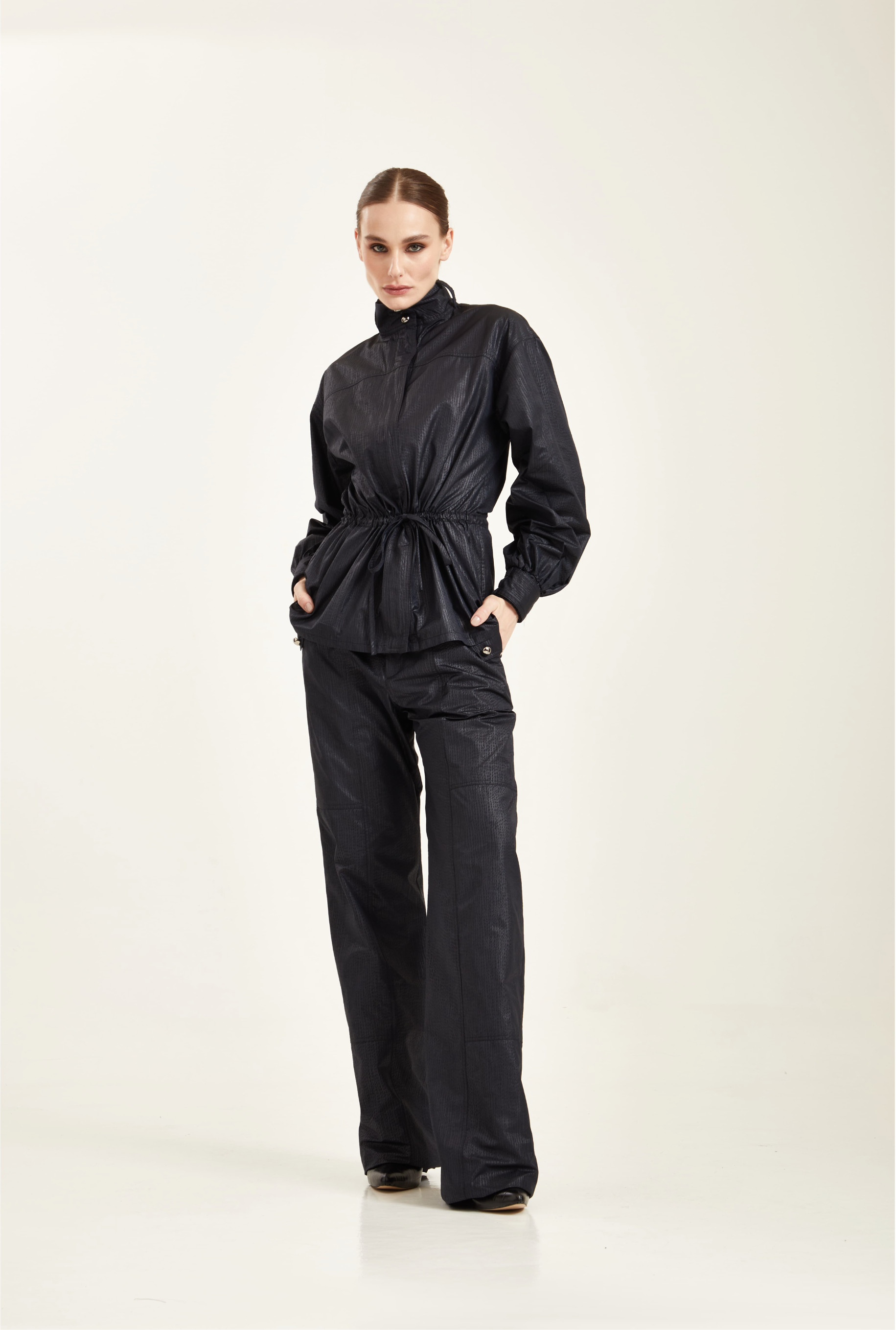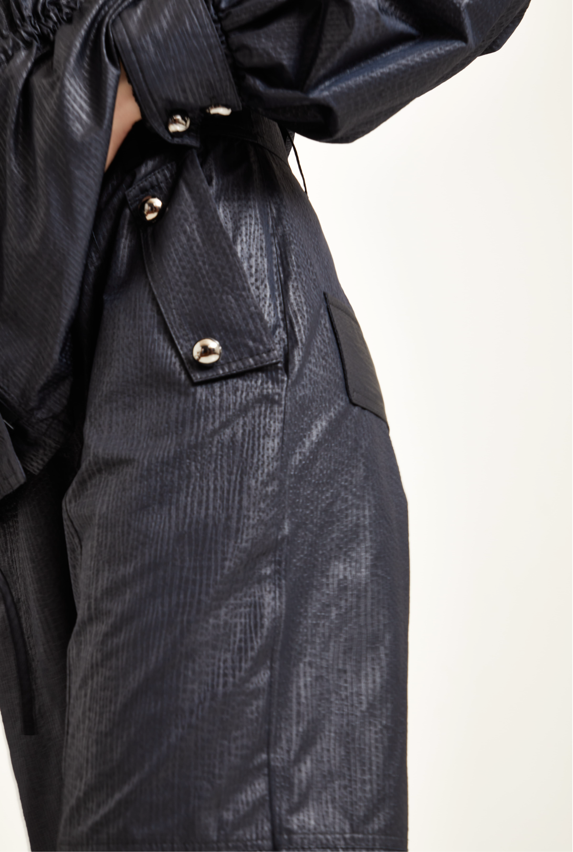 Produzida em tecido sintético leve e texturizado, a calça Arquipélago é perfeita para várias ocasiões, combinando o conforto da modelagem esportiva com um acabamento sofisticado para um visual versátil e atemporal. A peça possui modelagem reta e caimento solto ao corpo, similar ao de uma calça cargo, com recortes em seu comprimento, fechamento frontal com zíper, bolso faca com aplicação de botões de metal e bolso traseiro falso.