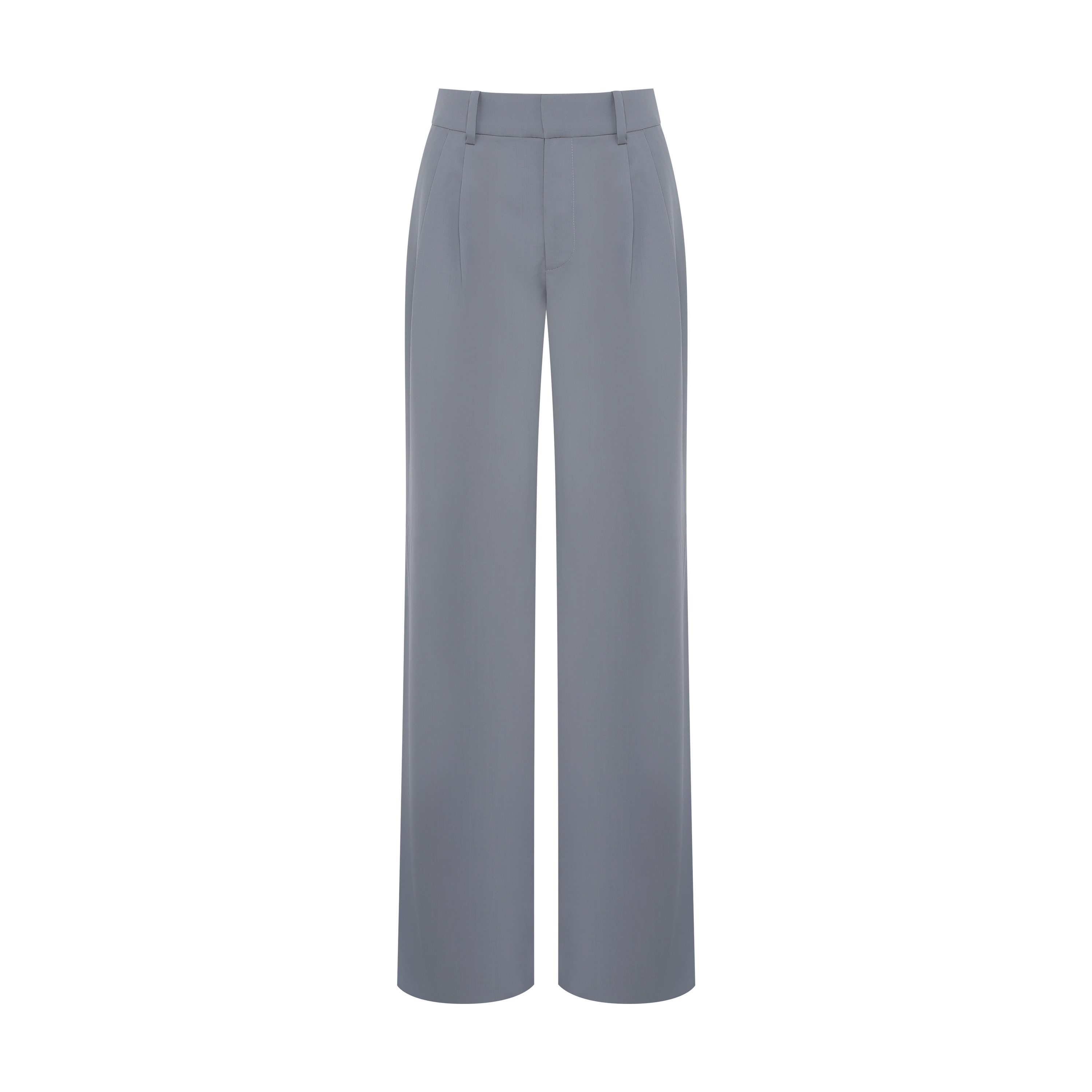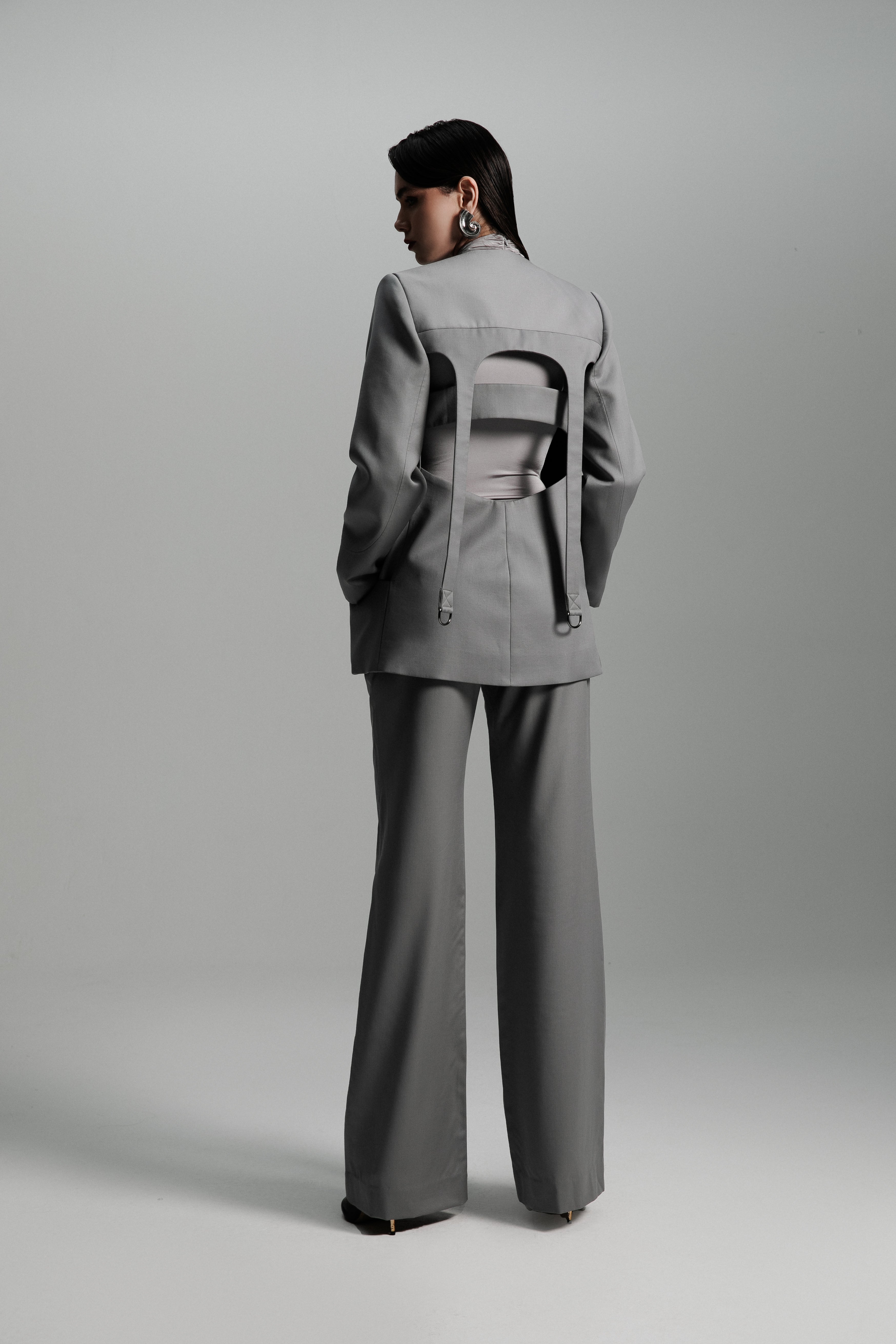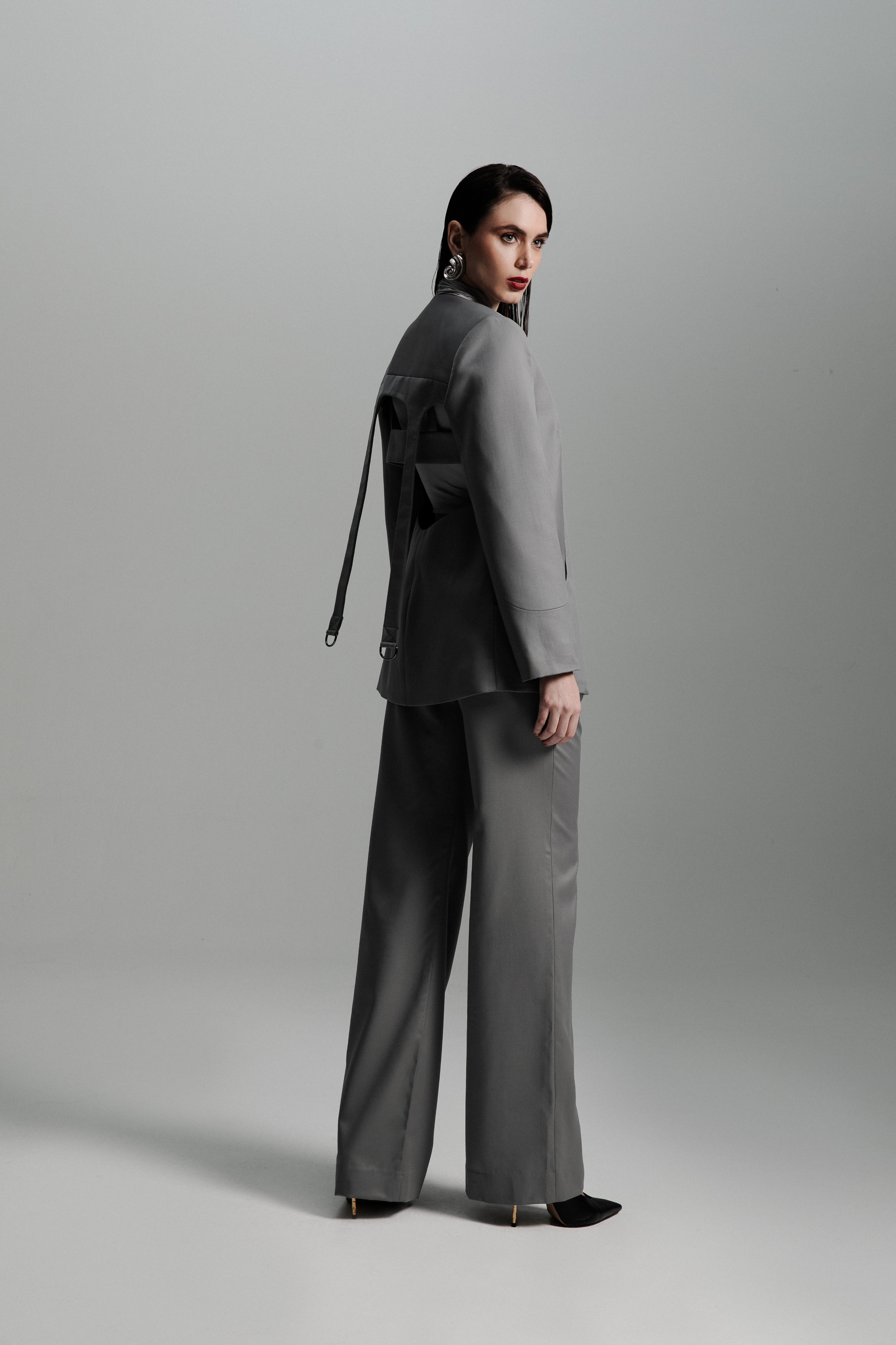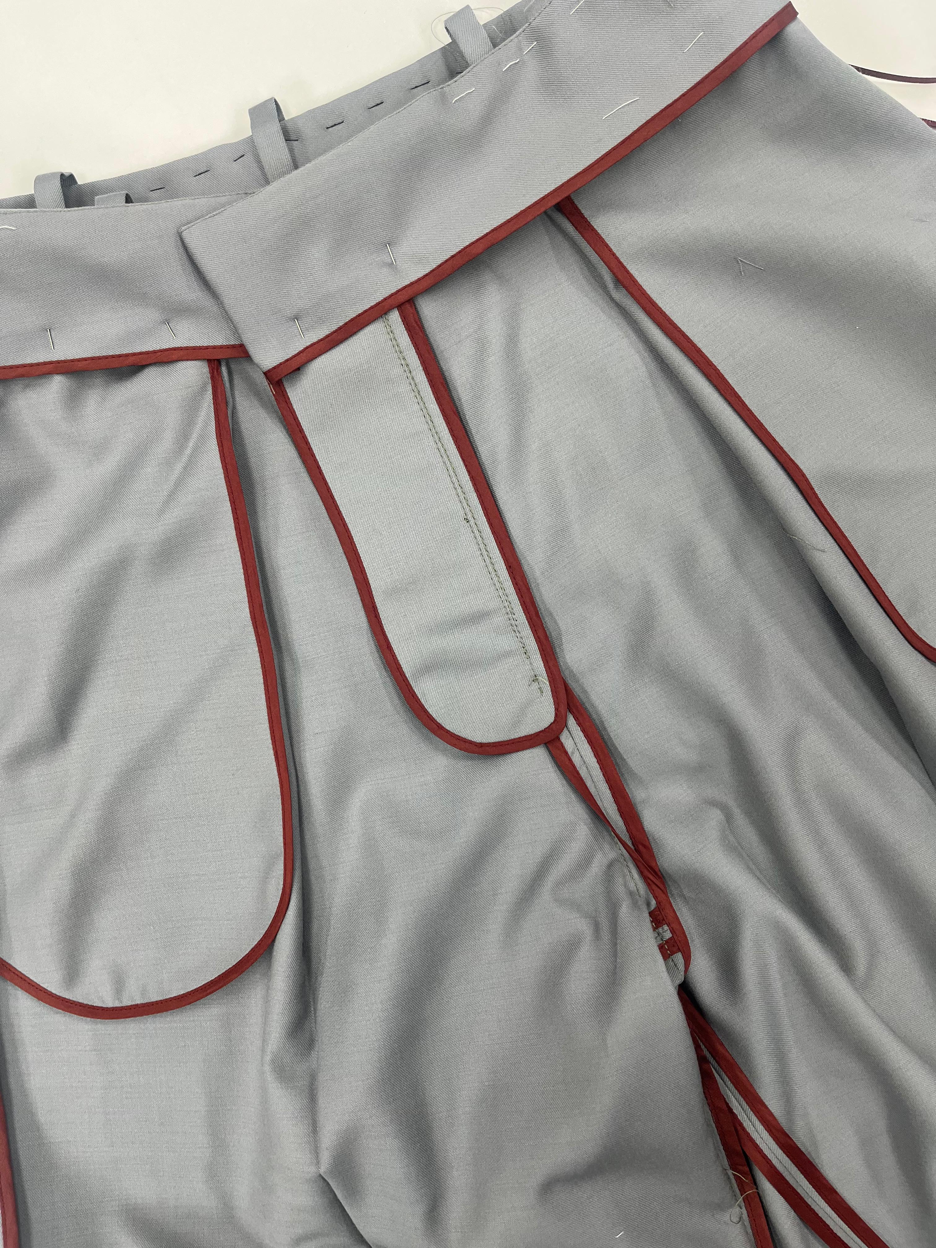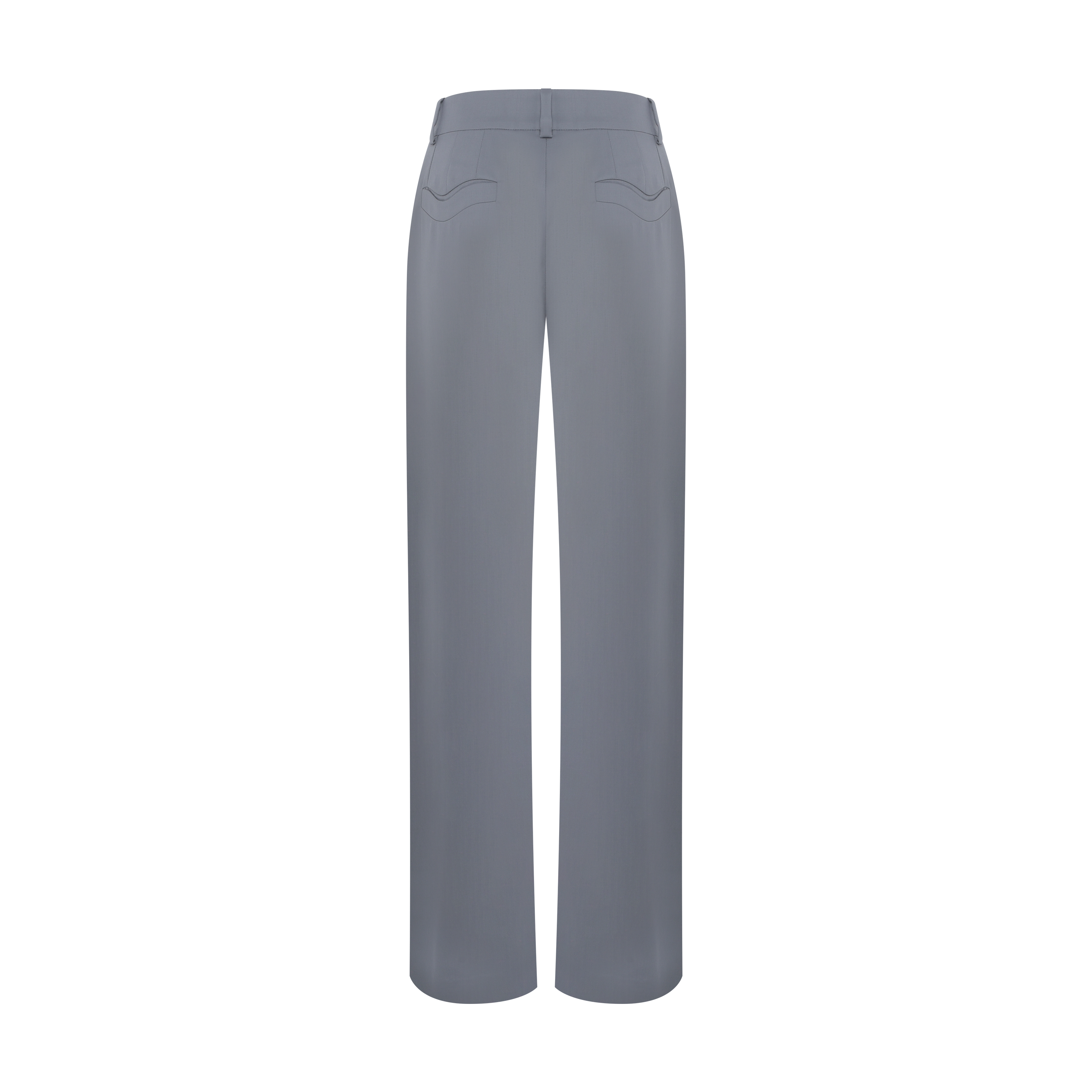 Confeccionada em gabardine cinza de lã fria Super 120, a Calça Cidade tem uma modelagem com altura de cintura confortável, em cima do umbigo, e pernas retas de comprimento rente ao chão. As costuras são cobertas por um viés acetinado na cor burgundy, valorizando e ornamentando também o avesso do produto. Possui duas pregas na frente, bolsos faca e, nas costas, duas casas inglesas em curvas; reforçando assim, a identidade de toda série exclusiva.