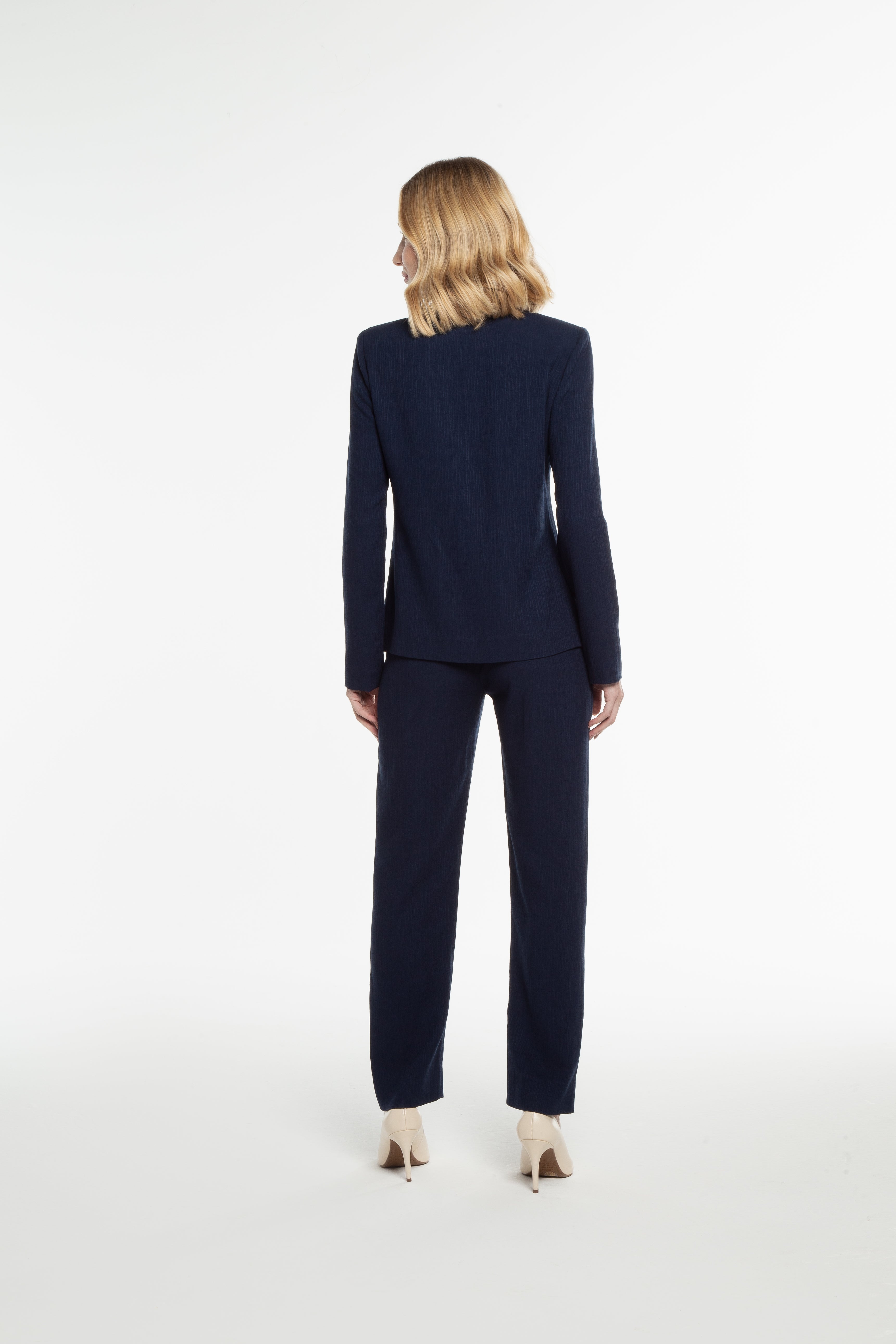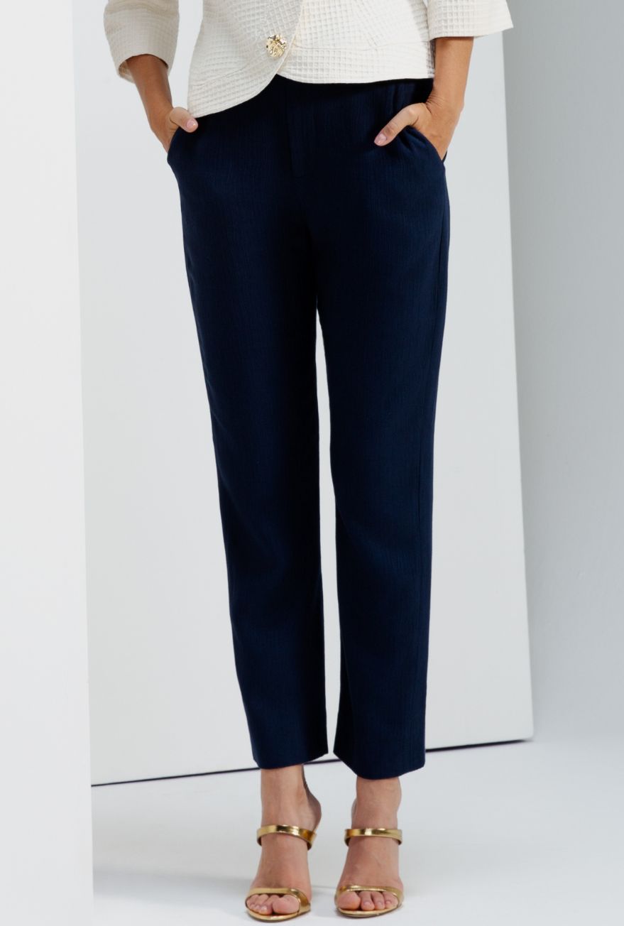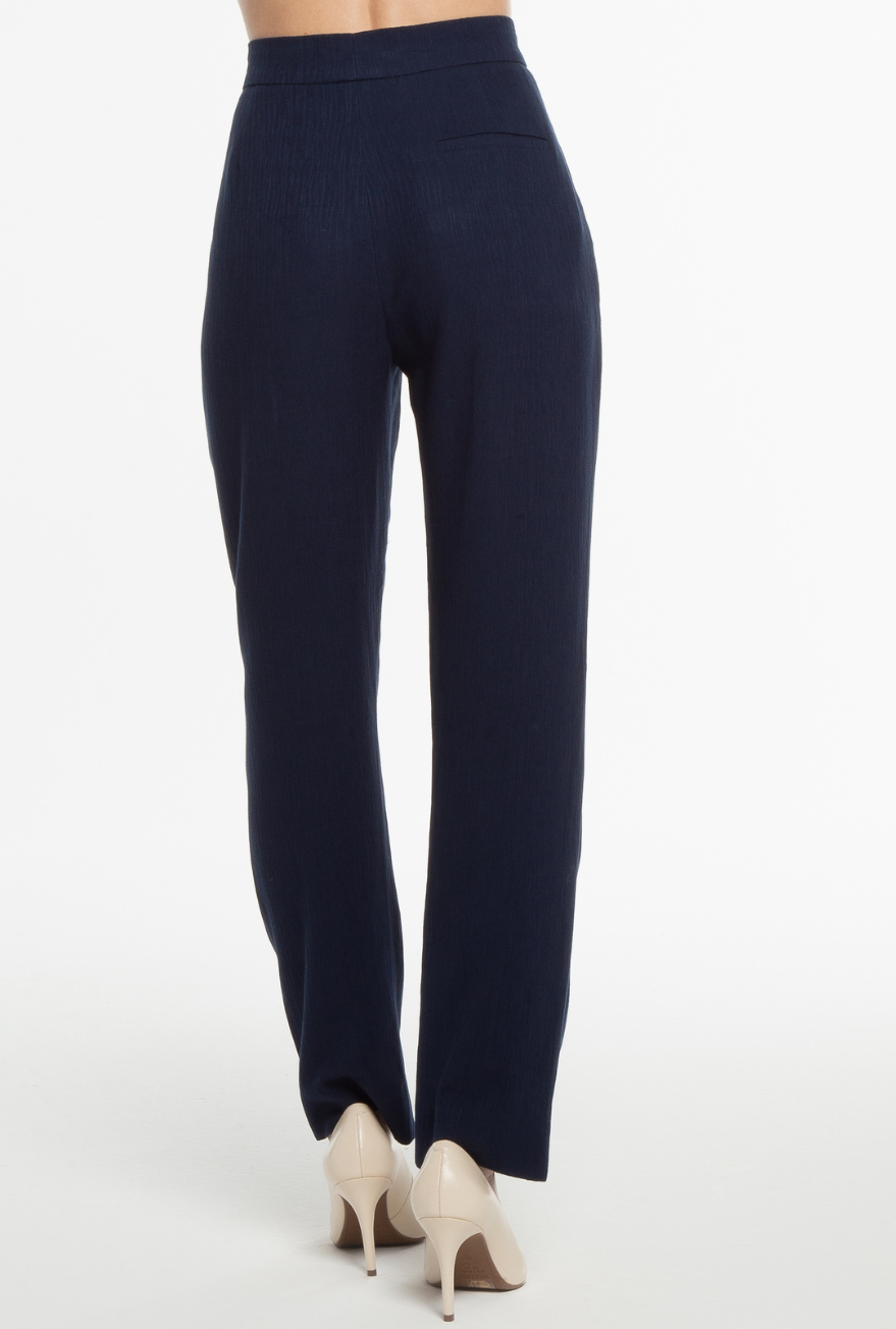 A Calça Noturna é fabricada em tecido de viscose texturizada e possui um elaborado acabamento interno inspirado na alfaiataria tradicional. Sua modelagem é mais sequinha e reta, com um comprimento levemente mais curto.
