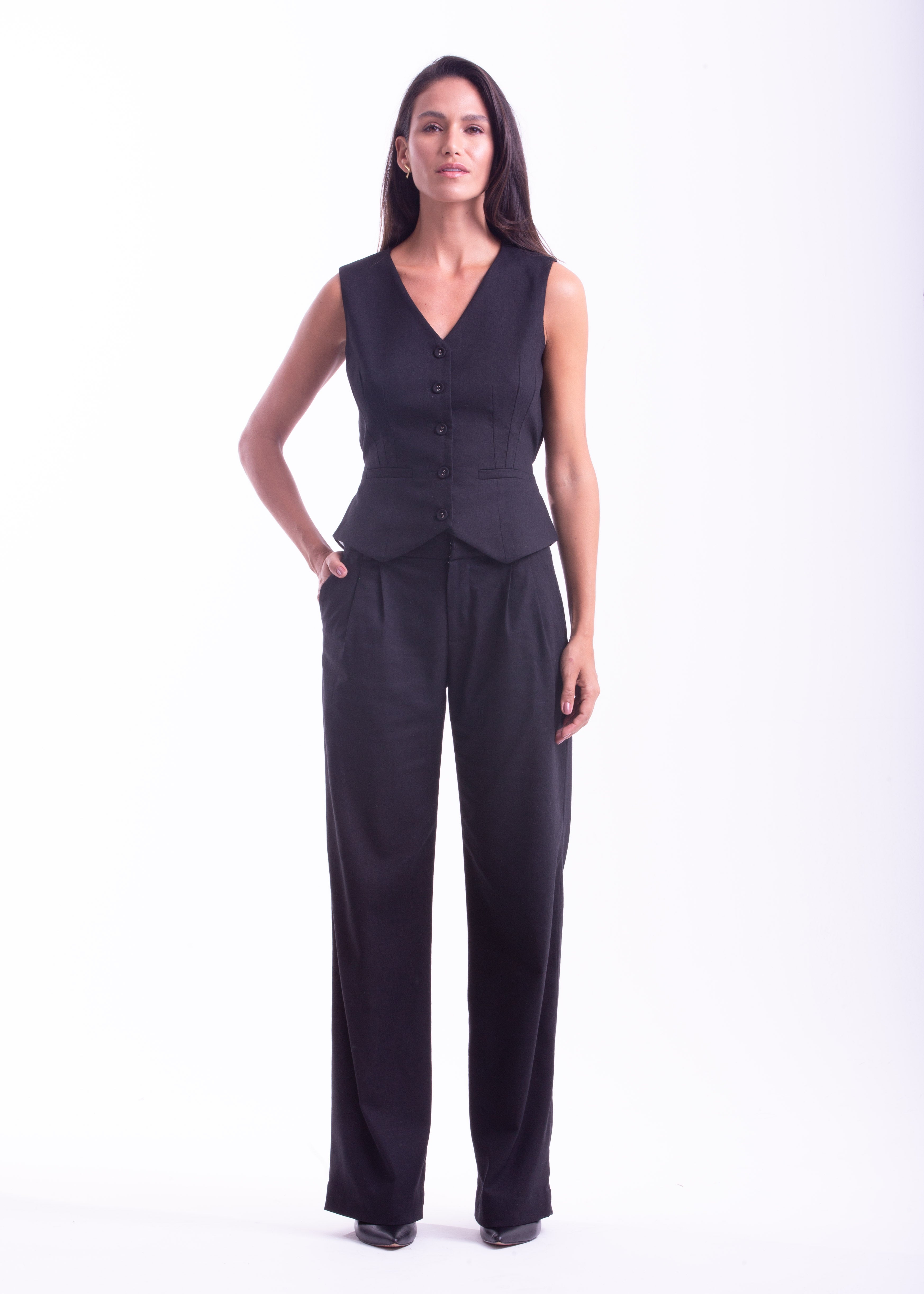 A calça Obsidiana, confeccionada com linho, viscose e elastano, traz modelagem moderna e reta com cintura baixa. O clássico fechamento com braguilha e gancho alfaiate complementado com detalhes de pregas na frente, bolso faca e casa inglesa na parte de trás, compõe um elegante e exclusivo visual.