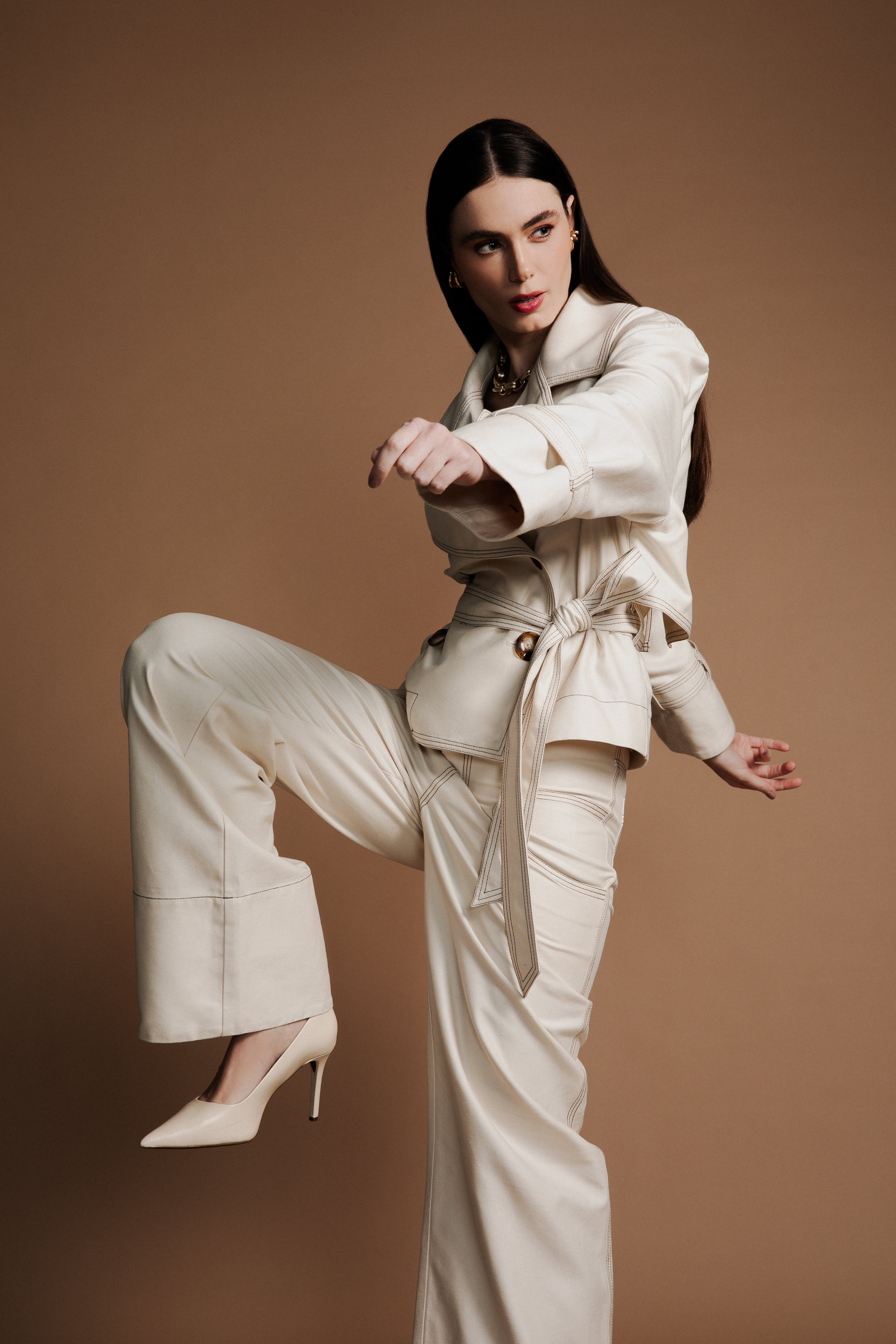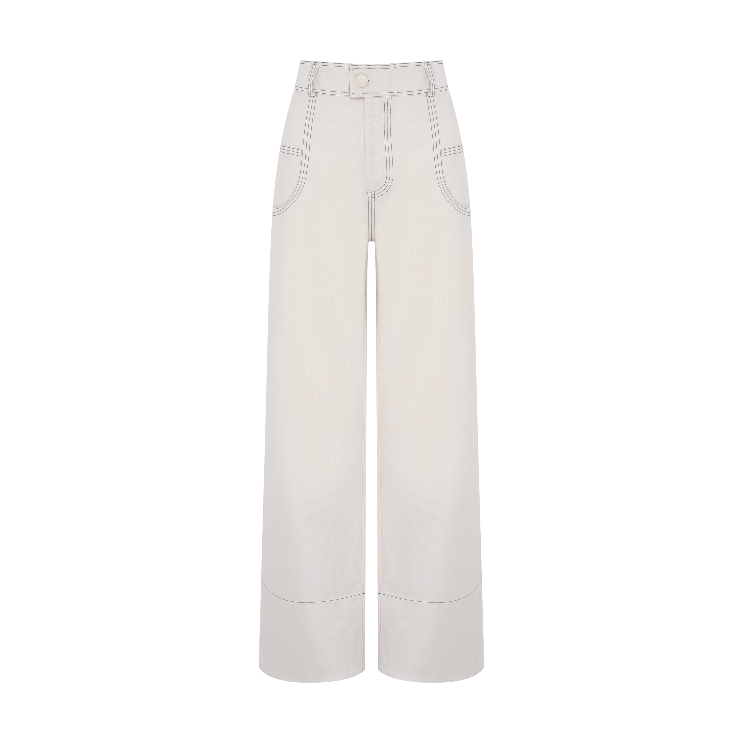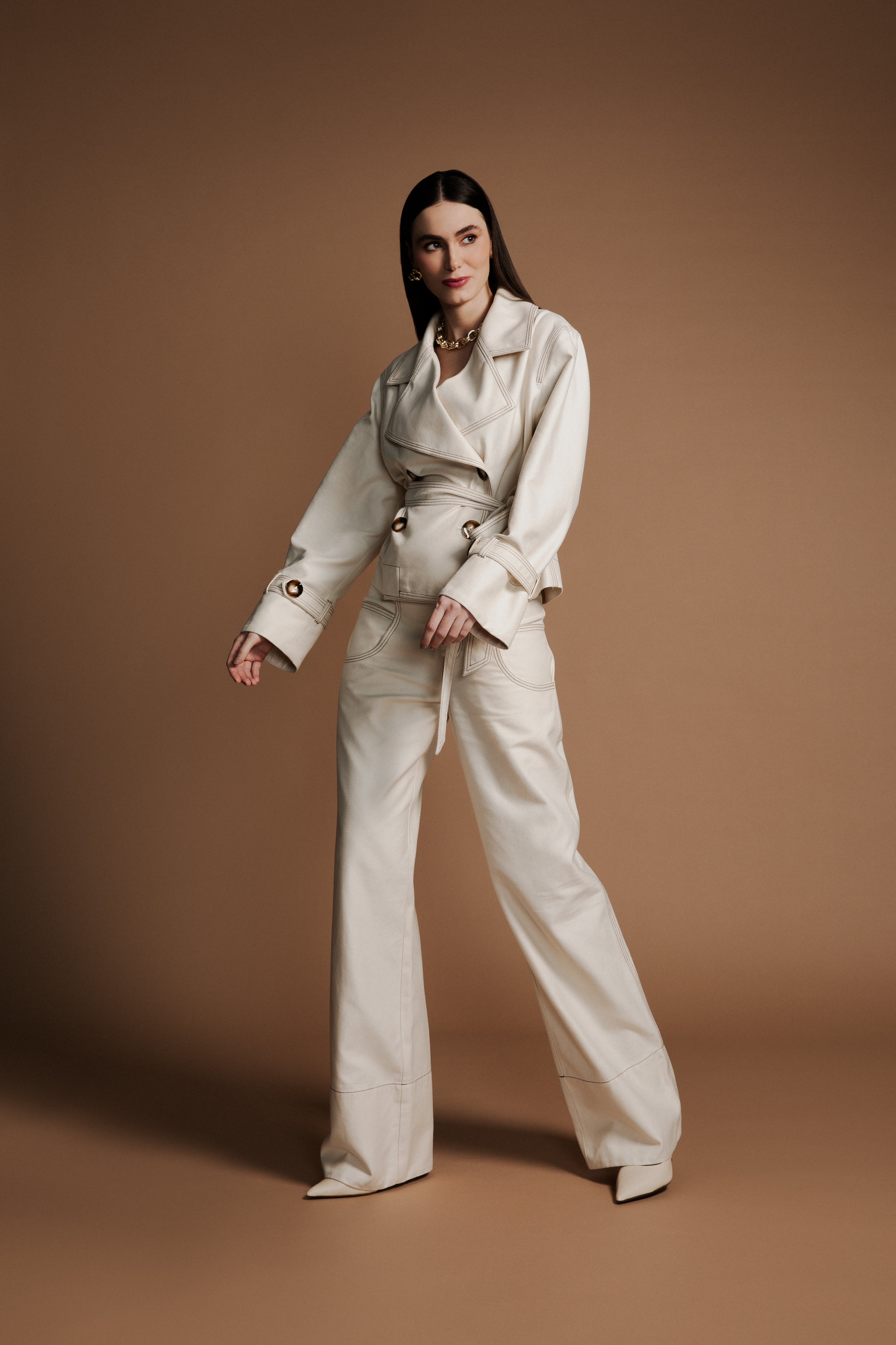 Fabricada em sarja de alta qualidade, a Calça Projeto tem uma modelagem mais atualizada, uma cintura confortável em cima do umbigo e pernas retas, de comprimento bem rente ao chão. Os bolsos na frente são alongados e curvados, emoldurados por pespontos de linha marrom escuro, e eles também se espalham por toda extensão da peça, seguindo e destacando as linhas dos moldes em que foram projetados. A calça não possui forro e suas costuras são cobertas por um viés acetinado também marrom, possui uma pala nas costas e seu fechamento é feito por botão e braguilha com zíper.