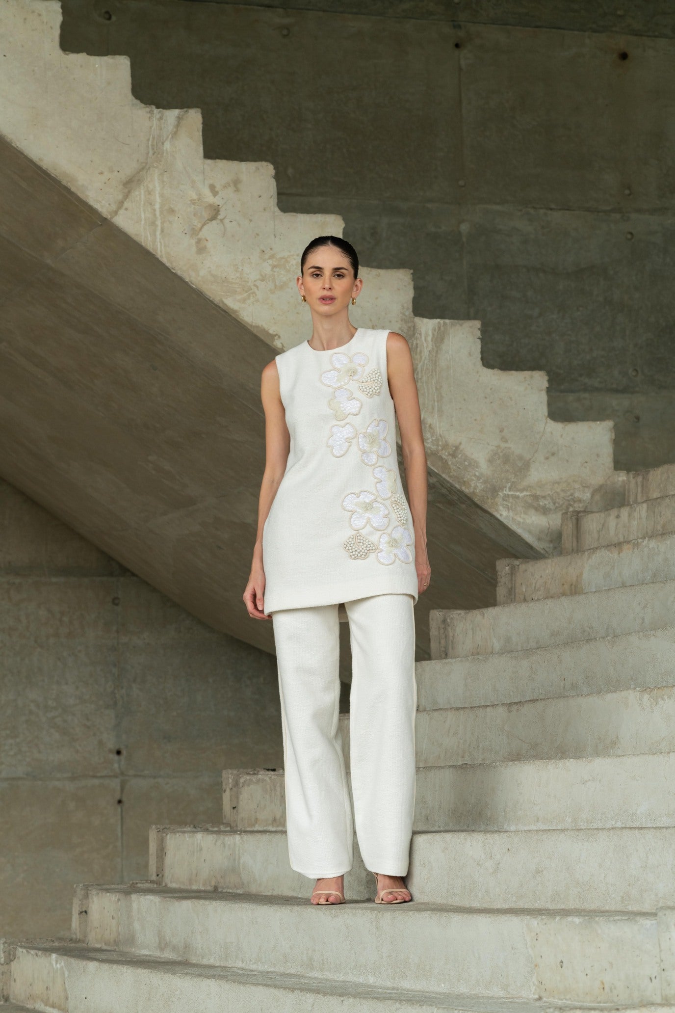 O vestido, de comprimento mini, é adornado por flores bordadas à mão.
