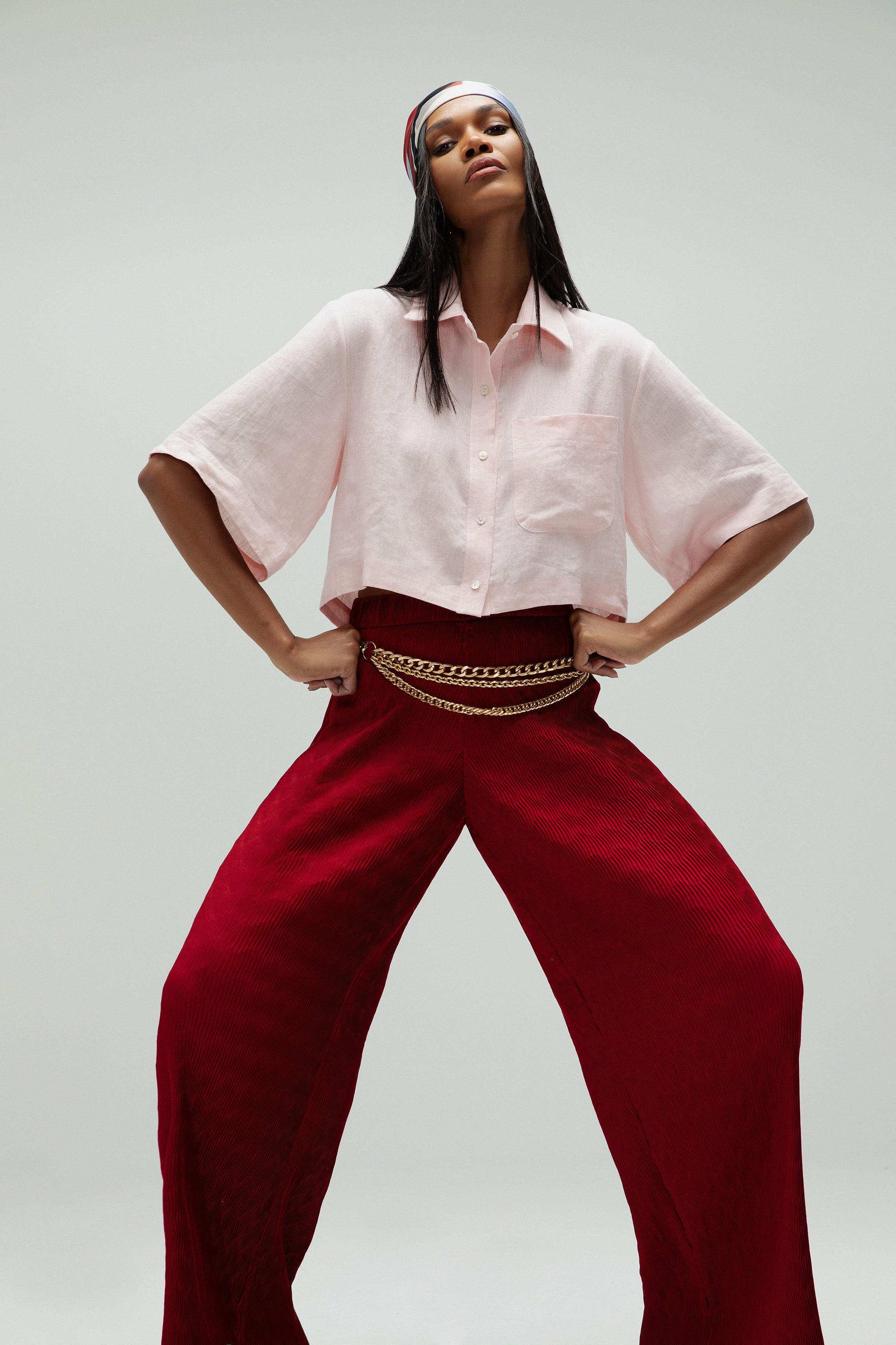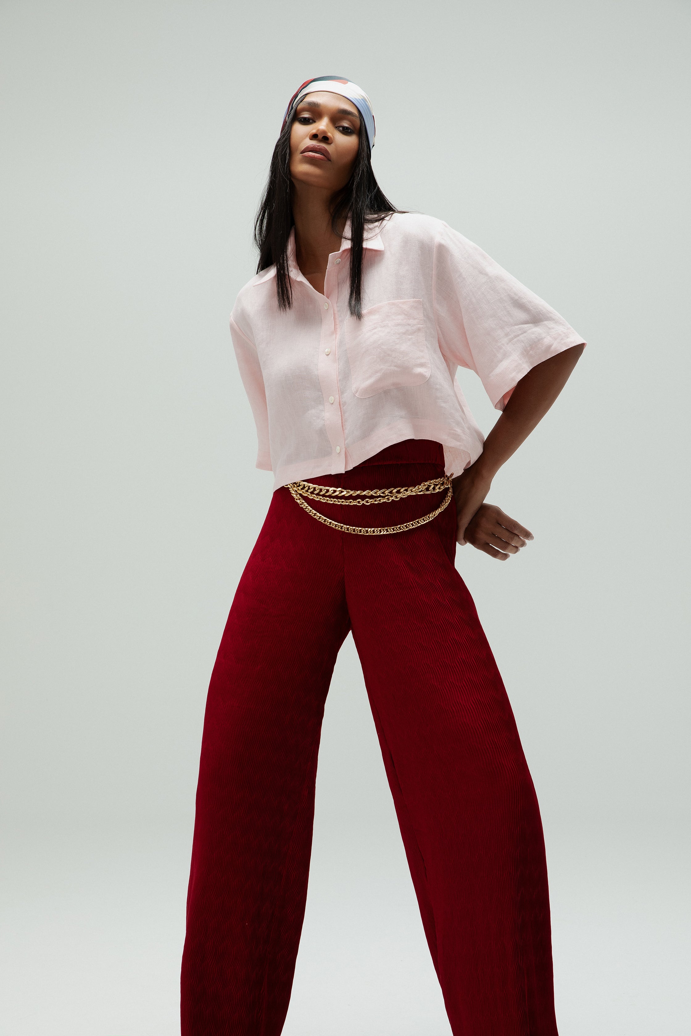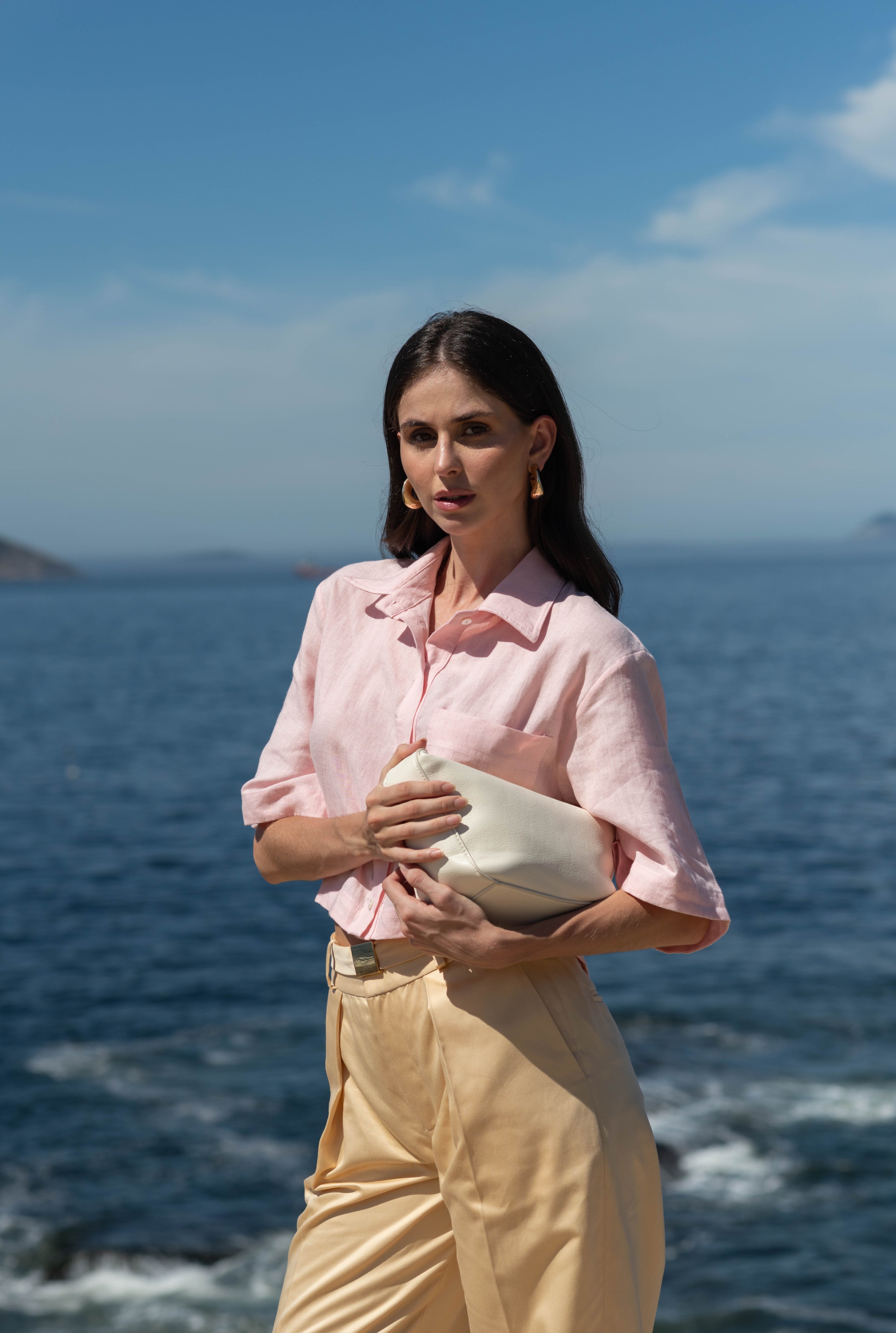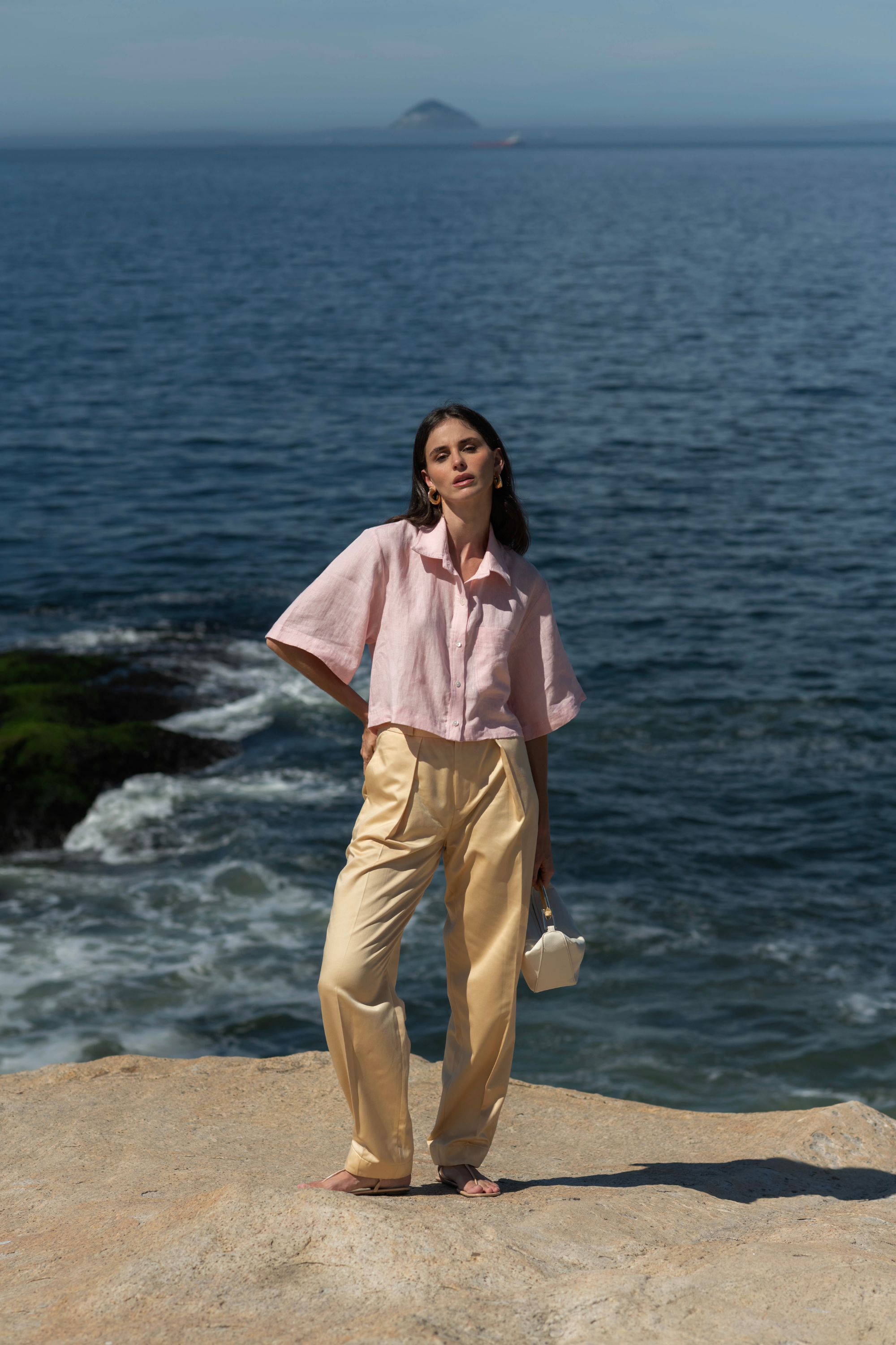 Produzida em 100% linho, a Camisa Plié é ideal para produções frescas de verão. Sua modelagem é ampla e curta, com um comprimento que se encerra na altura da cintura. As mangas, em forma de sino, acrescentam volume ao visual e criam uma silhueta relaxed & comfy. O produto possui um bolso aplicado no lado esquerdo e seu fechamento é feito por botões de madrepérola aplicados manualmente.