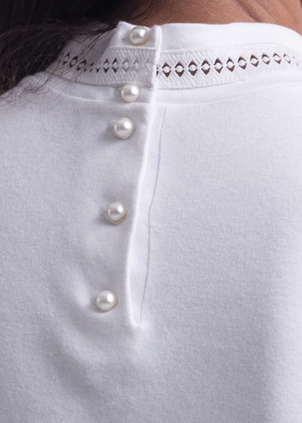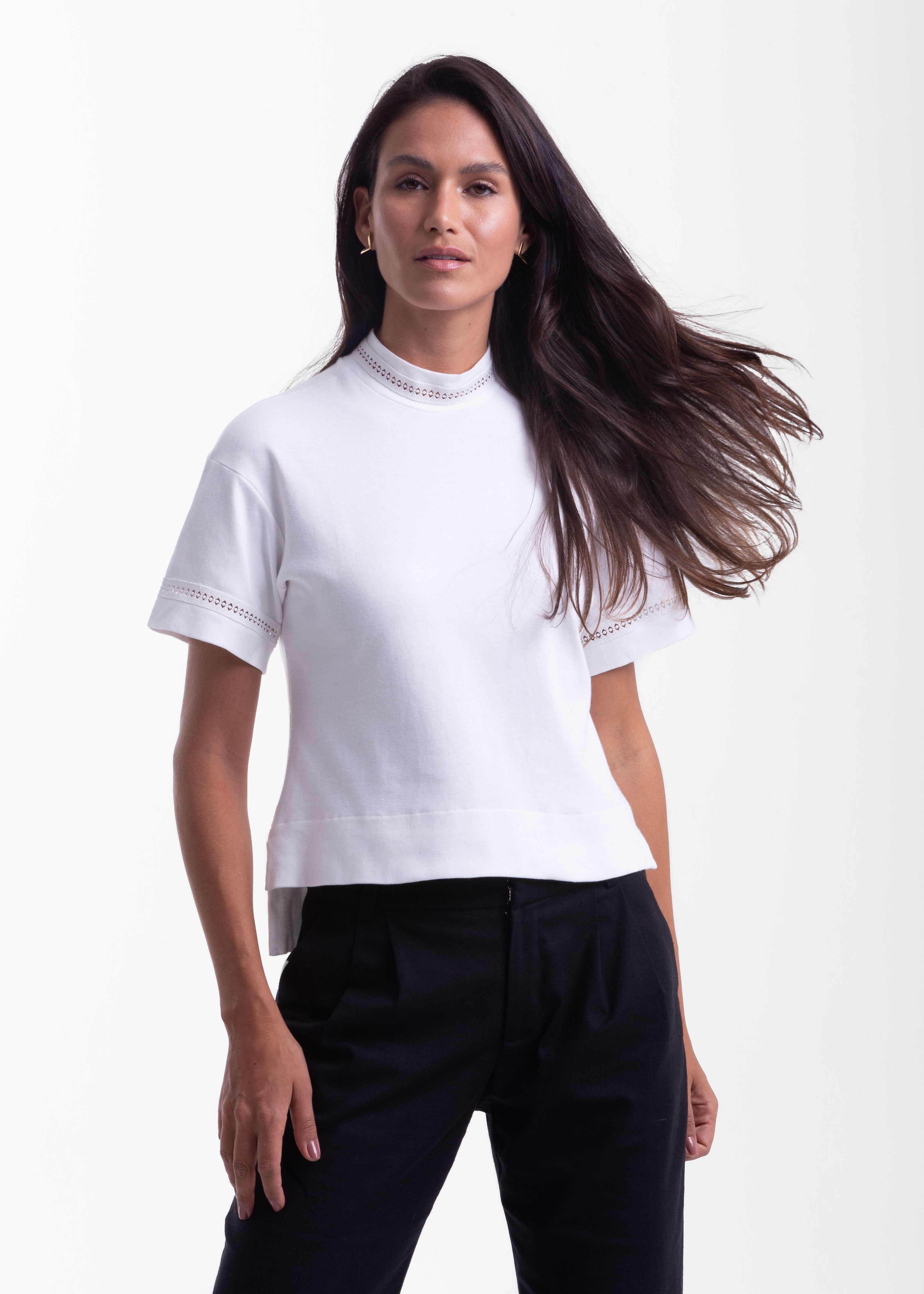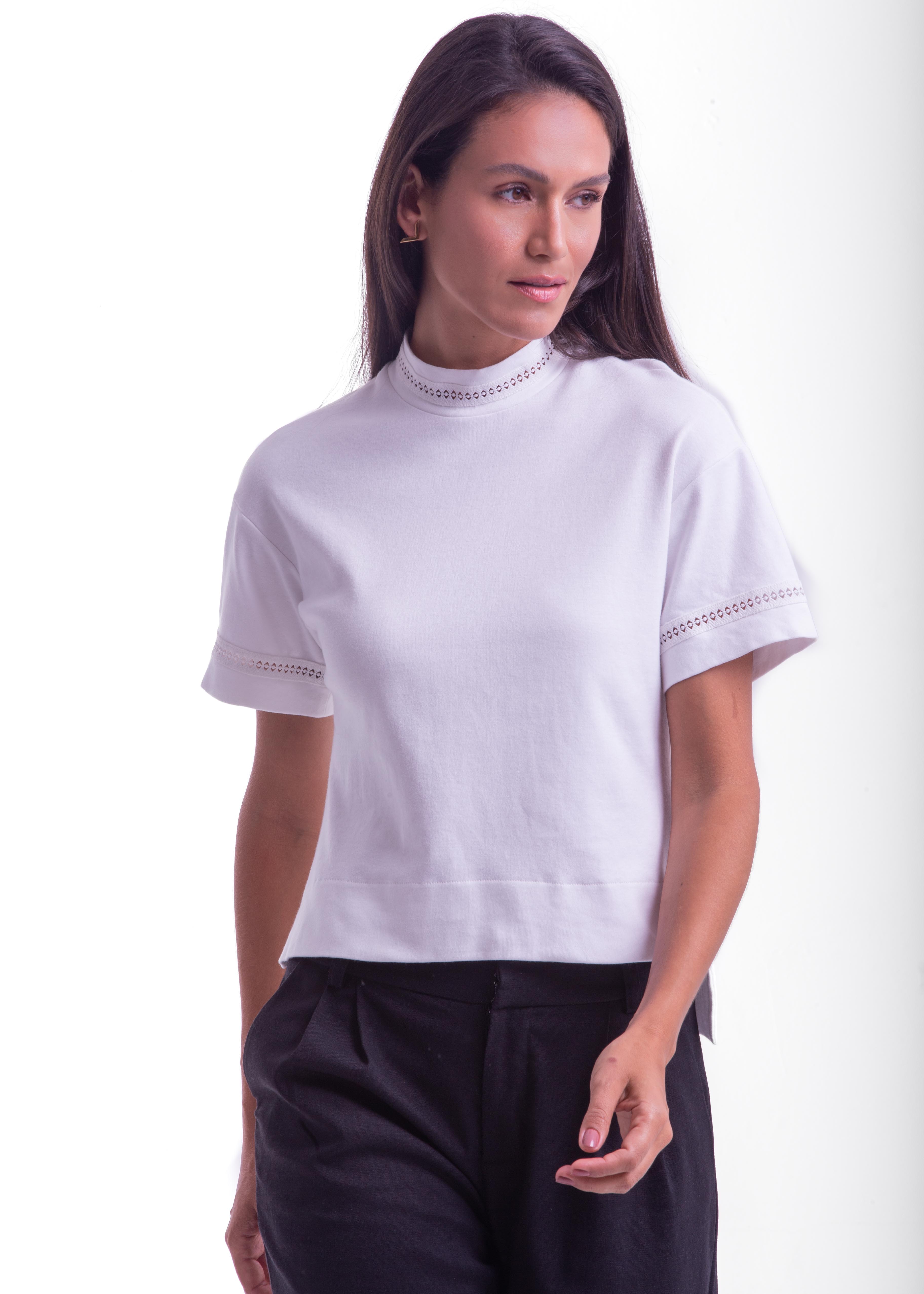 Camiseta de malha premium de algodão possui um caimento mais encorpado é adornada com entremeios geométricos na gola e mangas. A modelagem acompanha as curvas femininas e produz uma silhueta ajustada. O fechamento da peça é localizado na parte das costas e é feito por botões perolados.