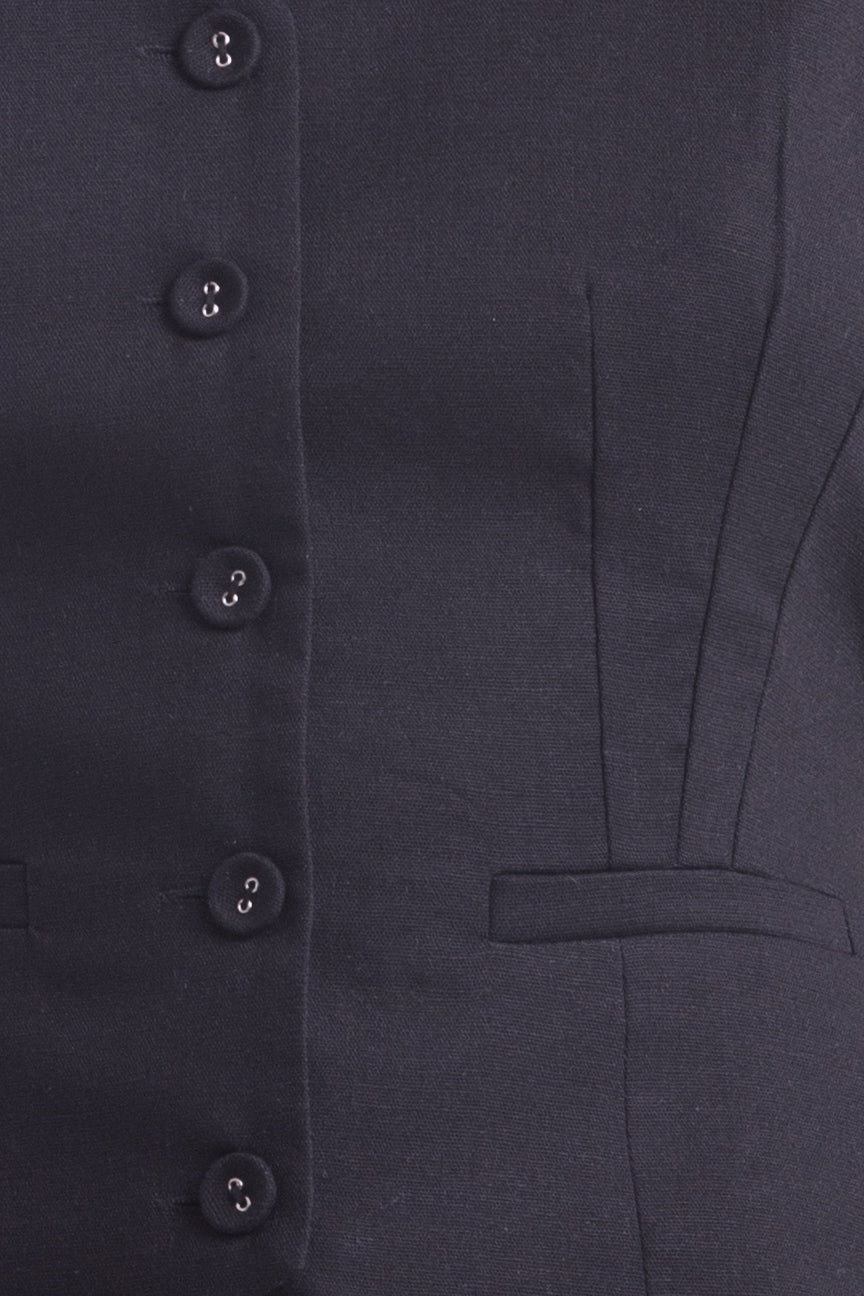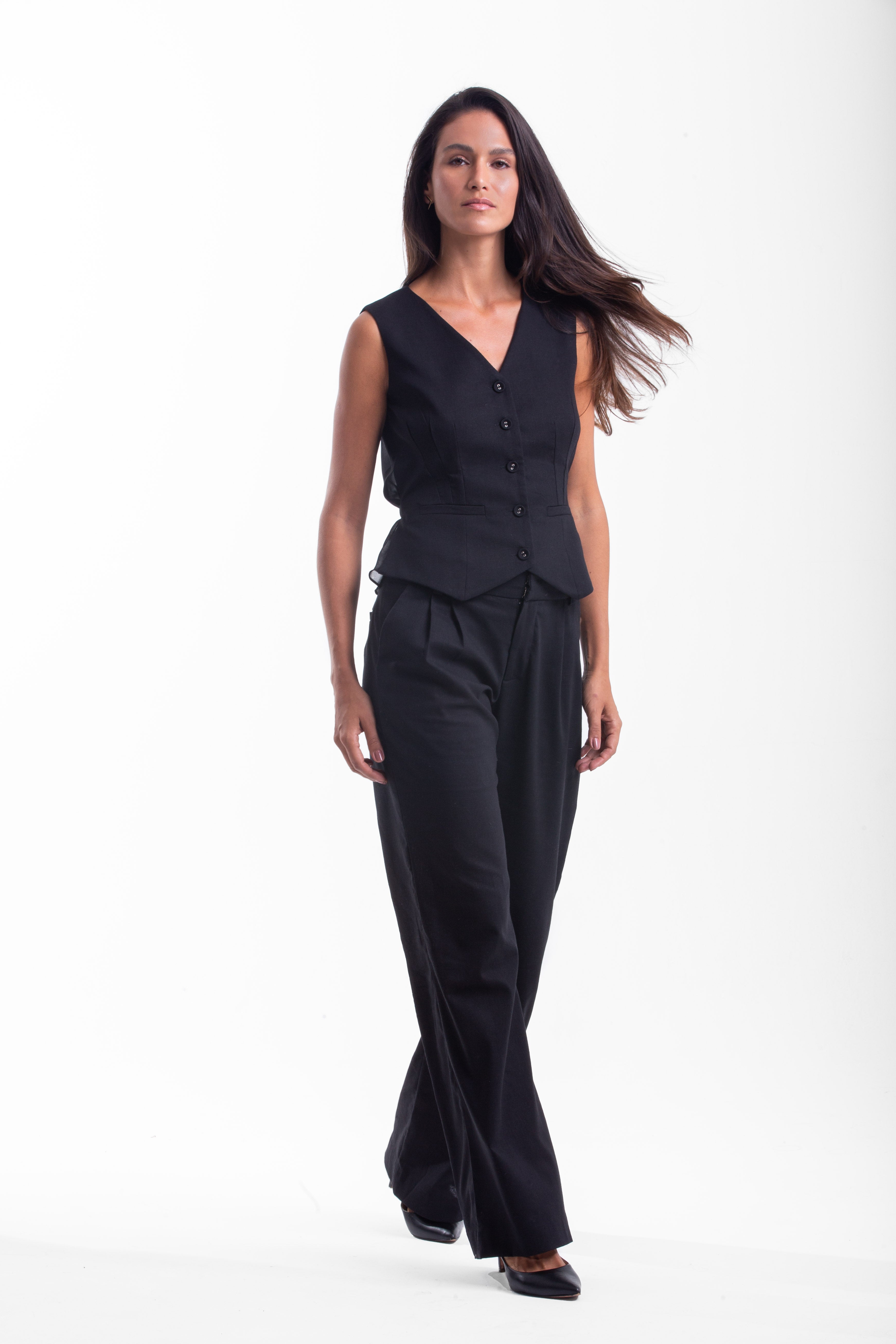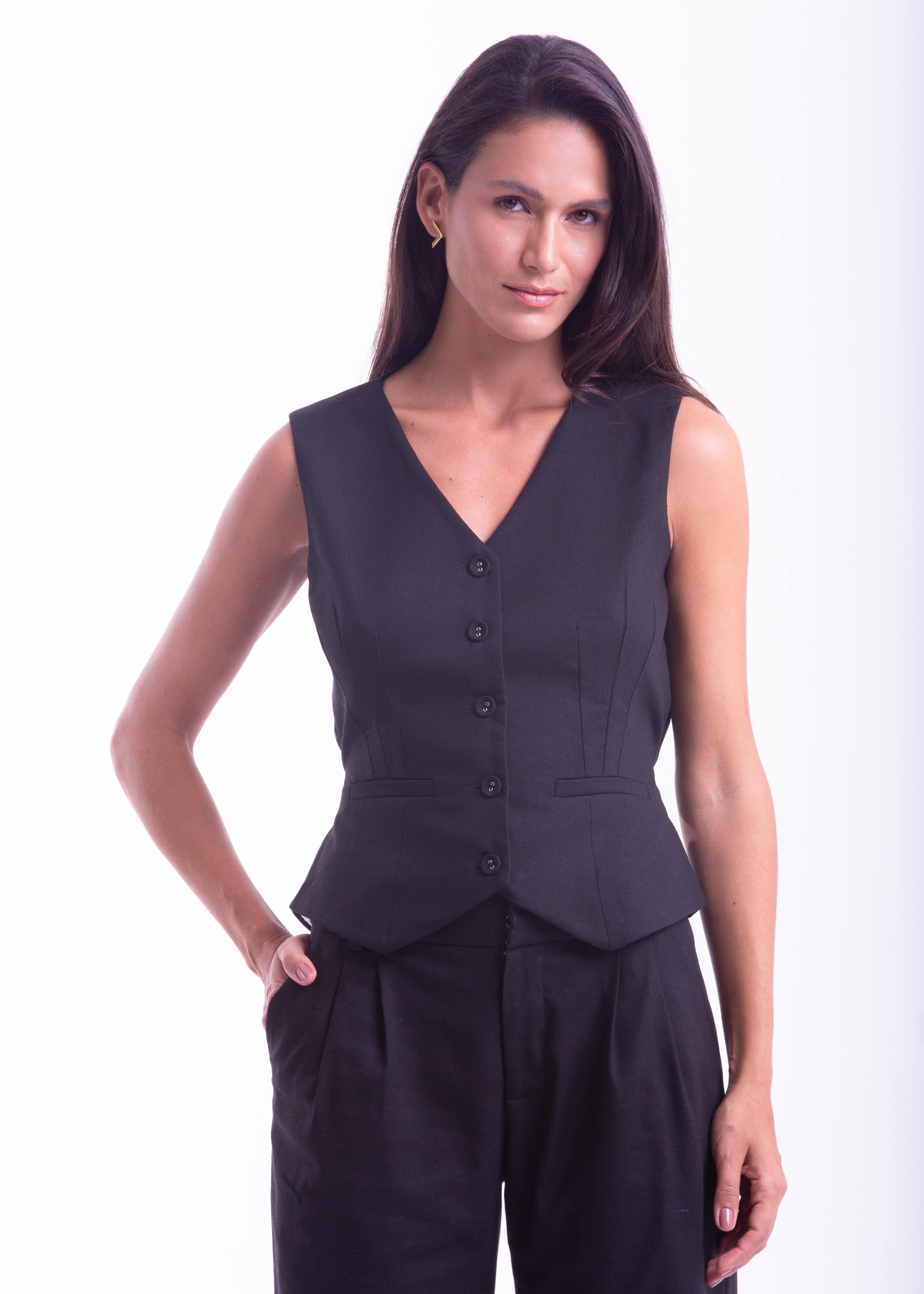 Colete de linho, viscose e elastano tem modelagem tradicional de alfaiataria, fechamento com lindos botões forrados na frente e um charmoso diferencial nas costas em tecido georgette transparente da mesma cor do colete.