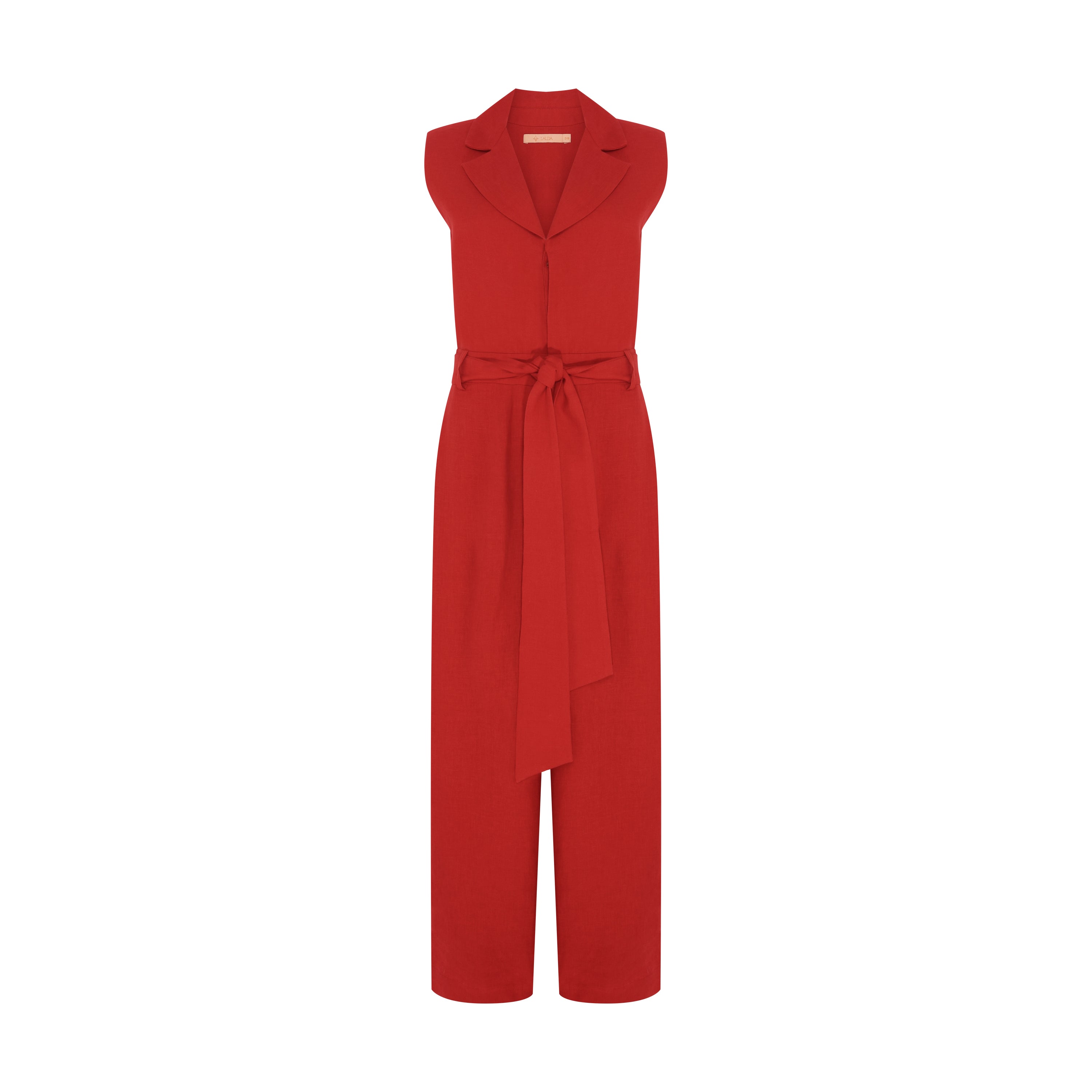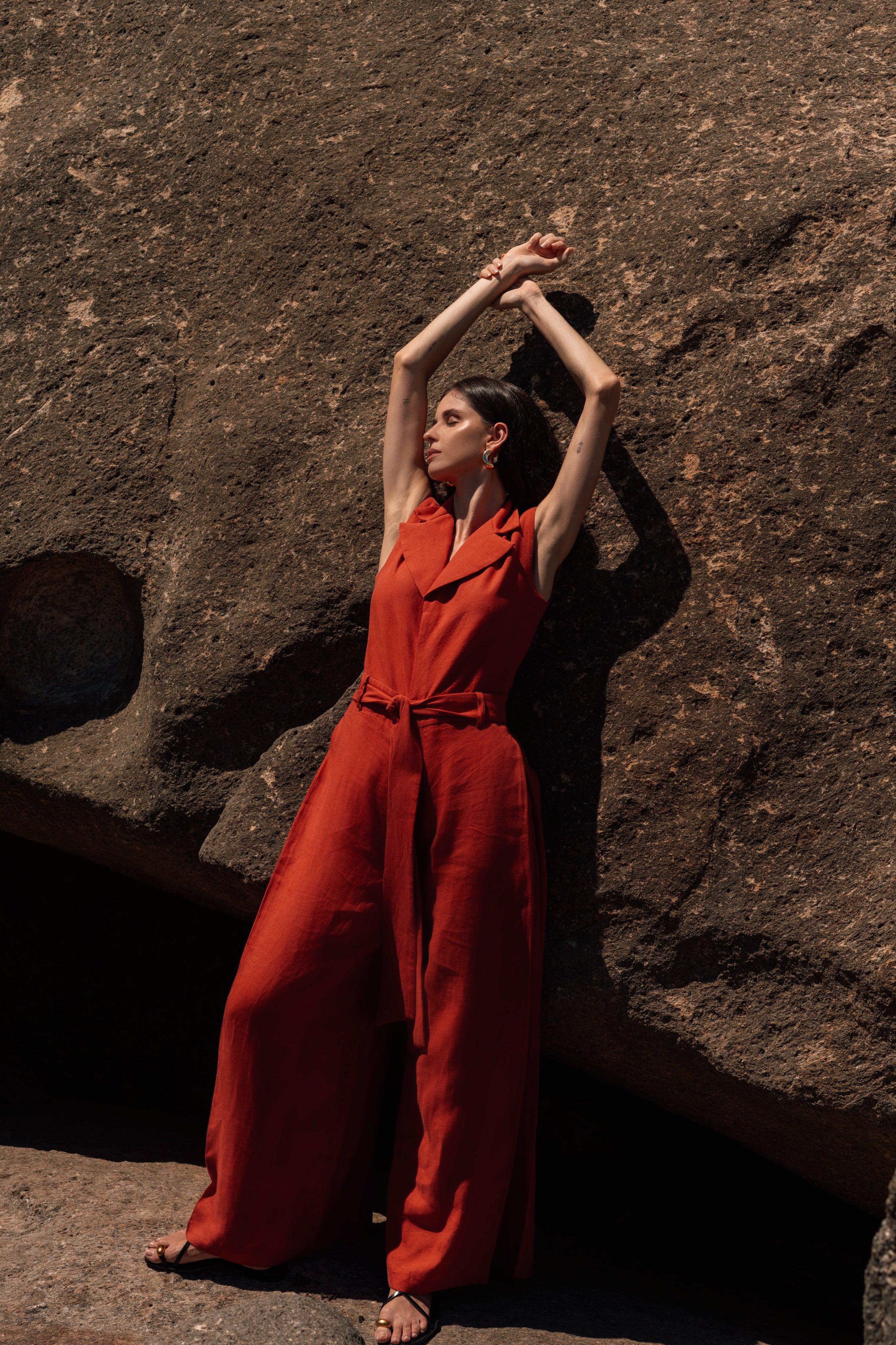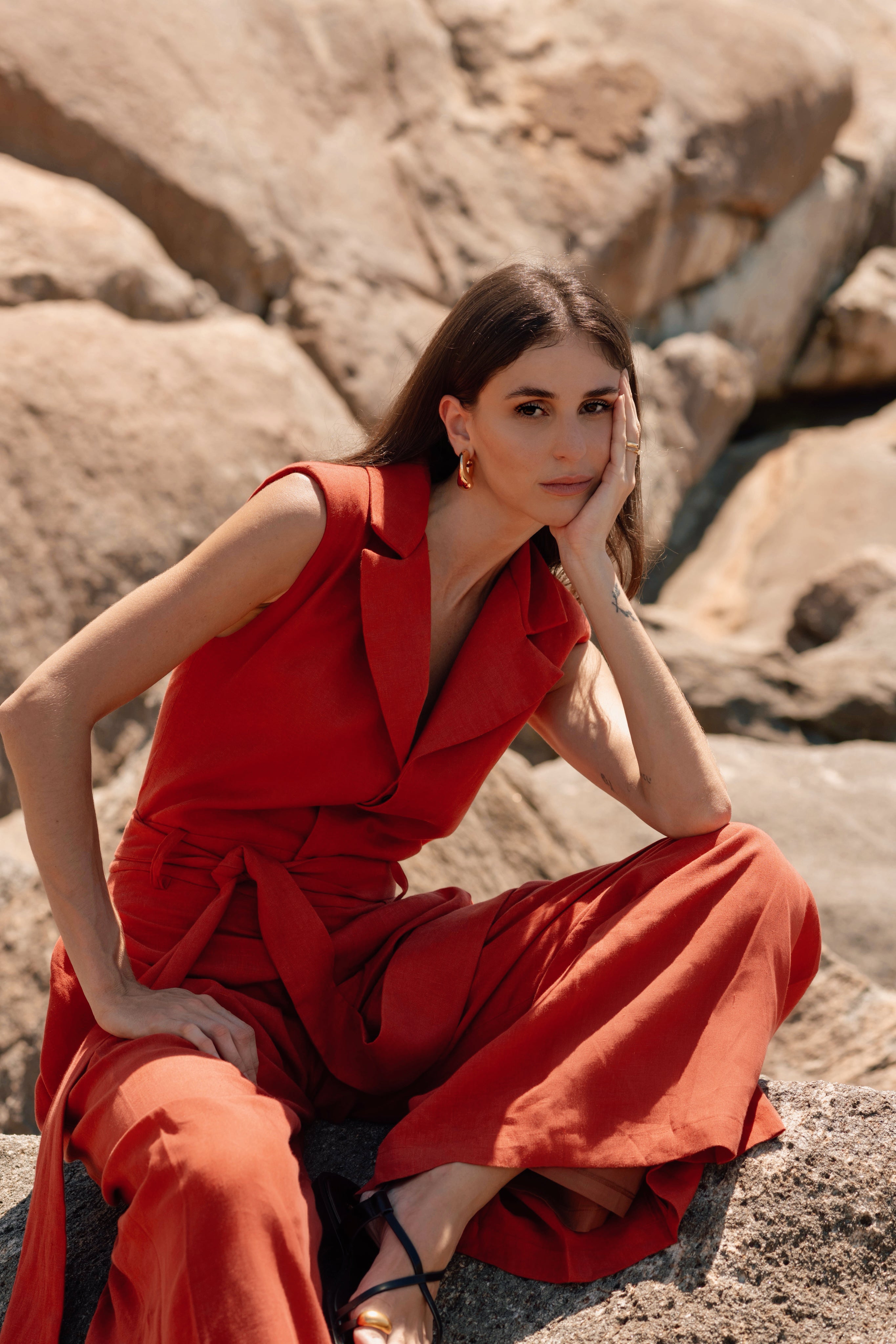 De tecido em 100% linho, este produto propõe um visual descomplicado e chic para os dias de verão. Possui uma construção inspirada em alfaiataria e cria uma silhueta bem feminina ao ajustar o cós da cintura com uma faixa. O volume da parte inferior, criado pela modelagem pantalona, ganha movimento através das pregas nas laterais. Possui ombreiras, bolso invisível nas laterais e fechamento frontal com pate coberta e botões de madrepérola natural.