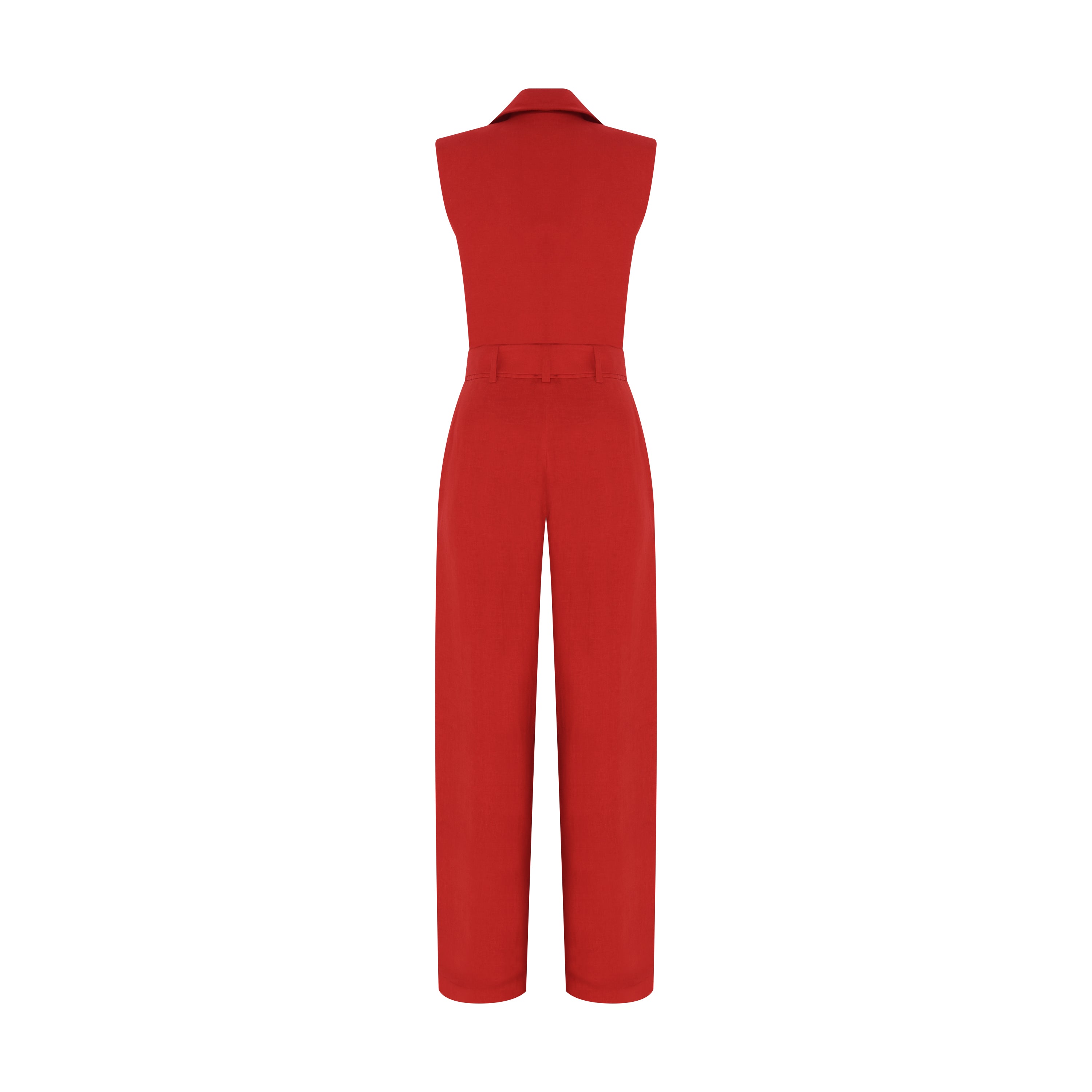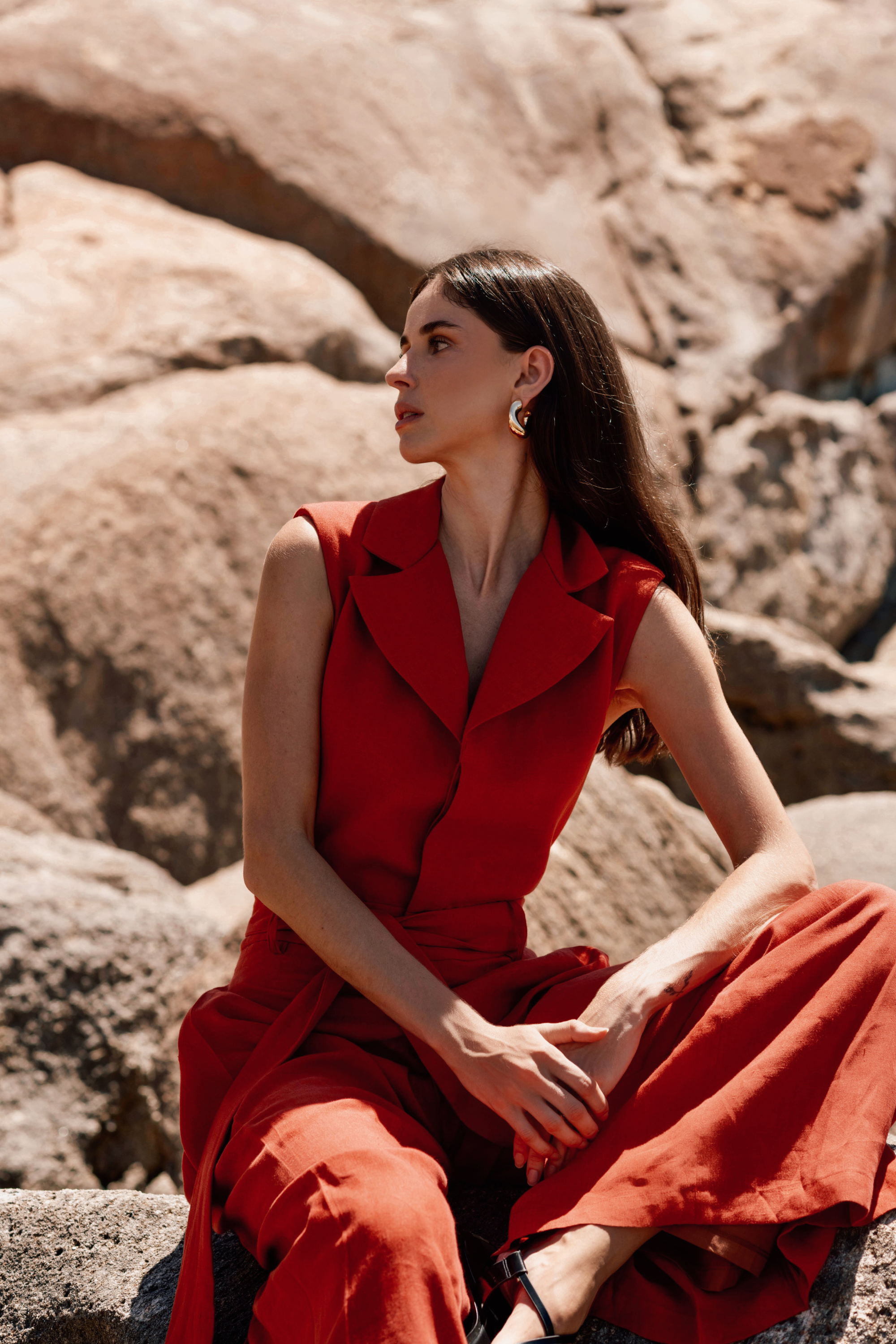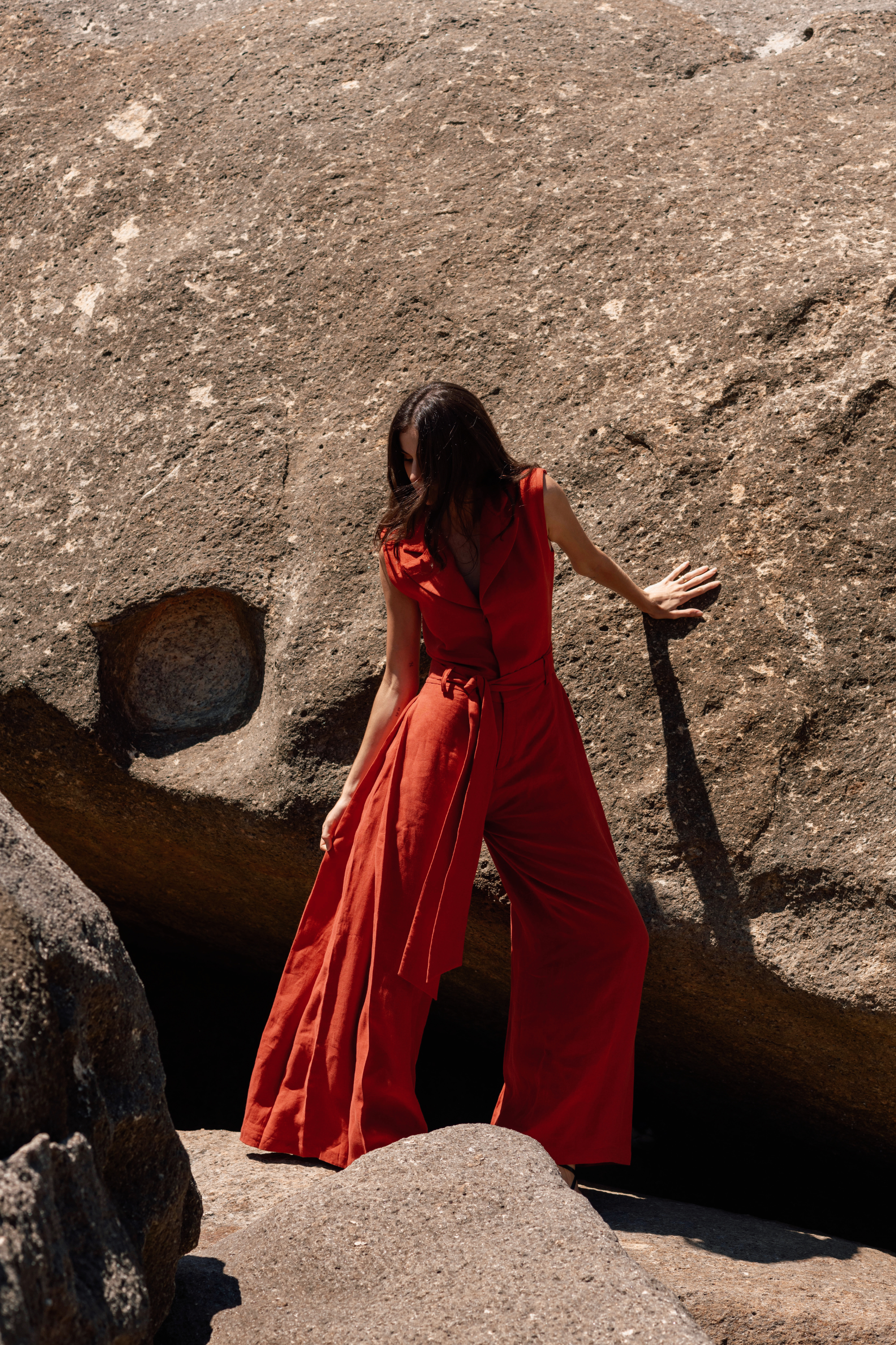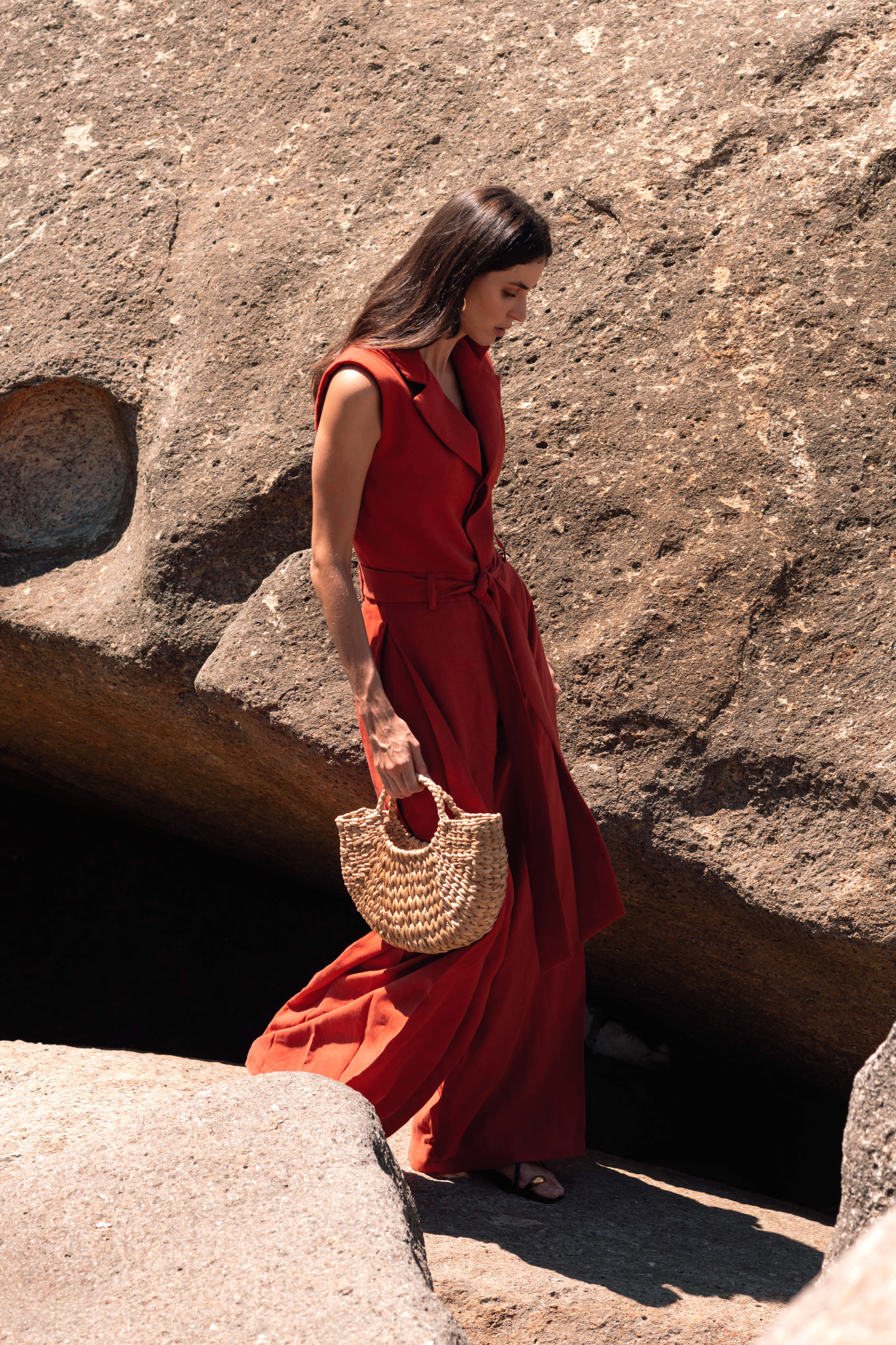 De tecido em 100% linho, este produto propõe um visual descomplicado e chic para os dias de verão. Possui uma construção inspirada em alfaiataria e cria uma silhueta bem feminina ao ajustar o cós da cintura com uma faixa. O volume da parte inferior, criado pela modelagem pantalona, ganha movimento através das pregas nas laterais. Possui ombreiras, bolso invisível nas laterais e fechamento frontal com pate coberta e botões de madrepérola natural.