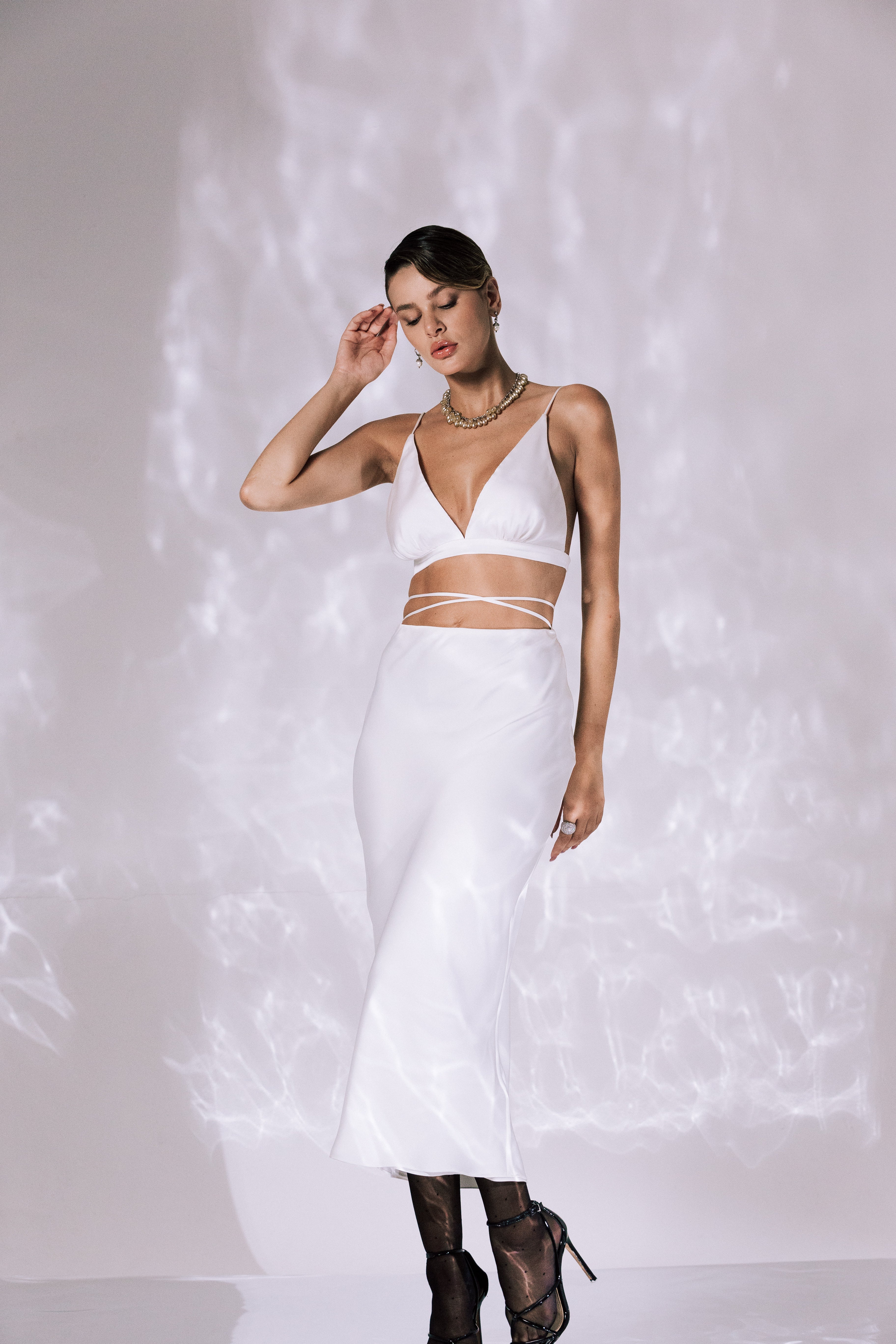 A saia em tecido acetinado de poliéster é toda dupla e possui comprimento midi, com modelagem enviesada formando uma silueta que acentua as curvas femininas. Duas tiras compridas do próprio tecido saem das laterais da cintura e sugerem uma amarração envolvendo o corpo. O fechamento por botões forrados nas costas é uma delicadeza, que arremata o estilo elegante deste produto.