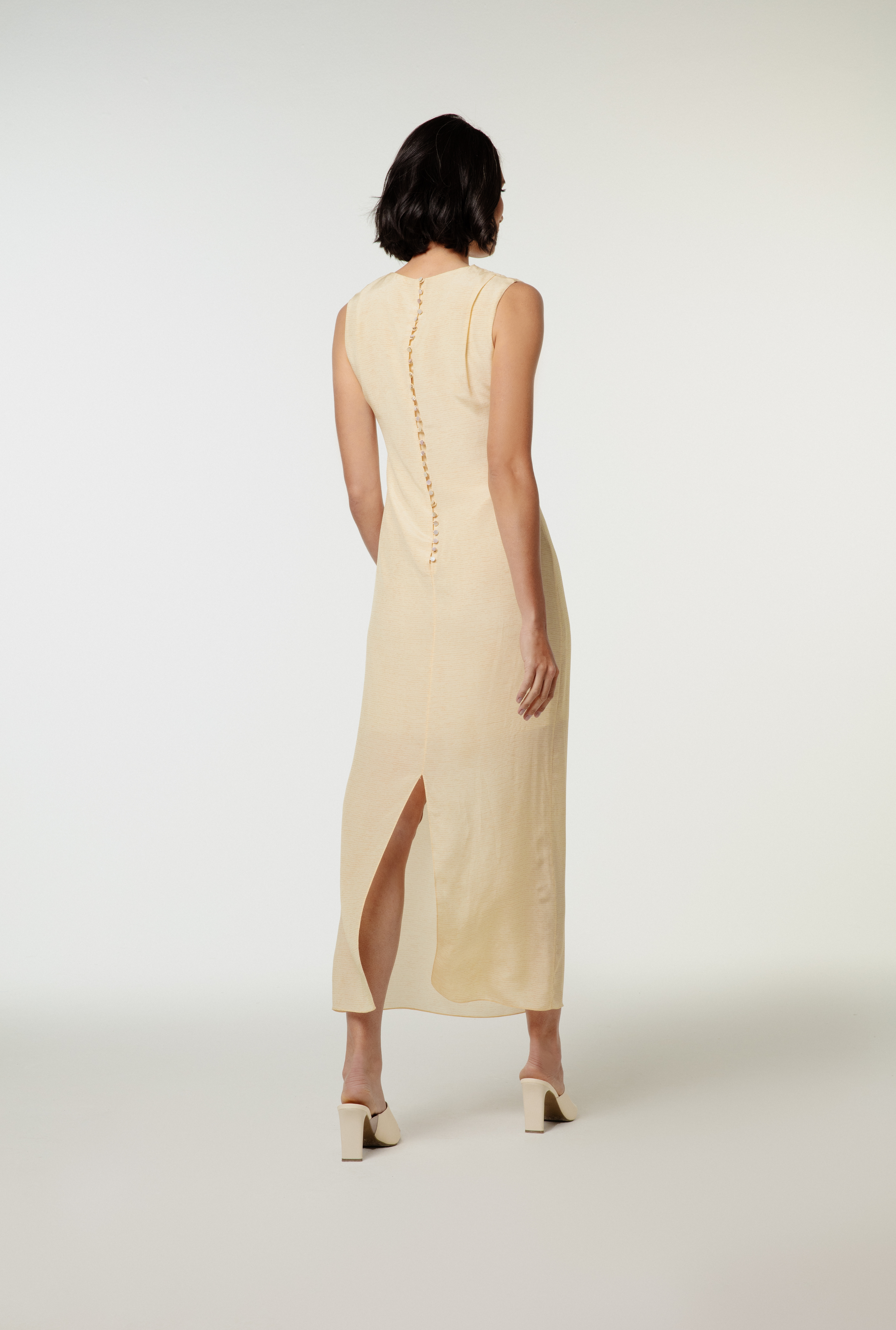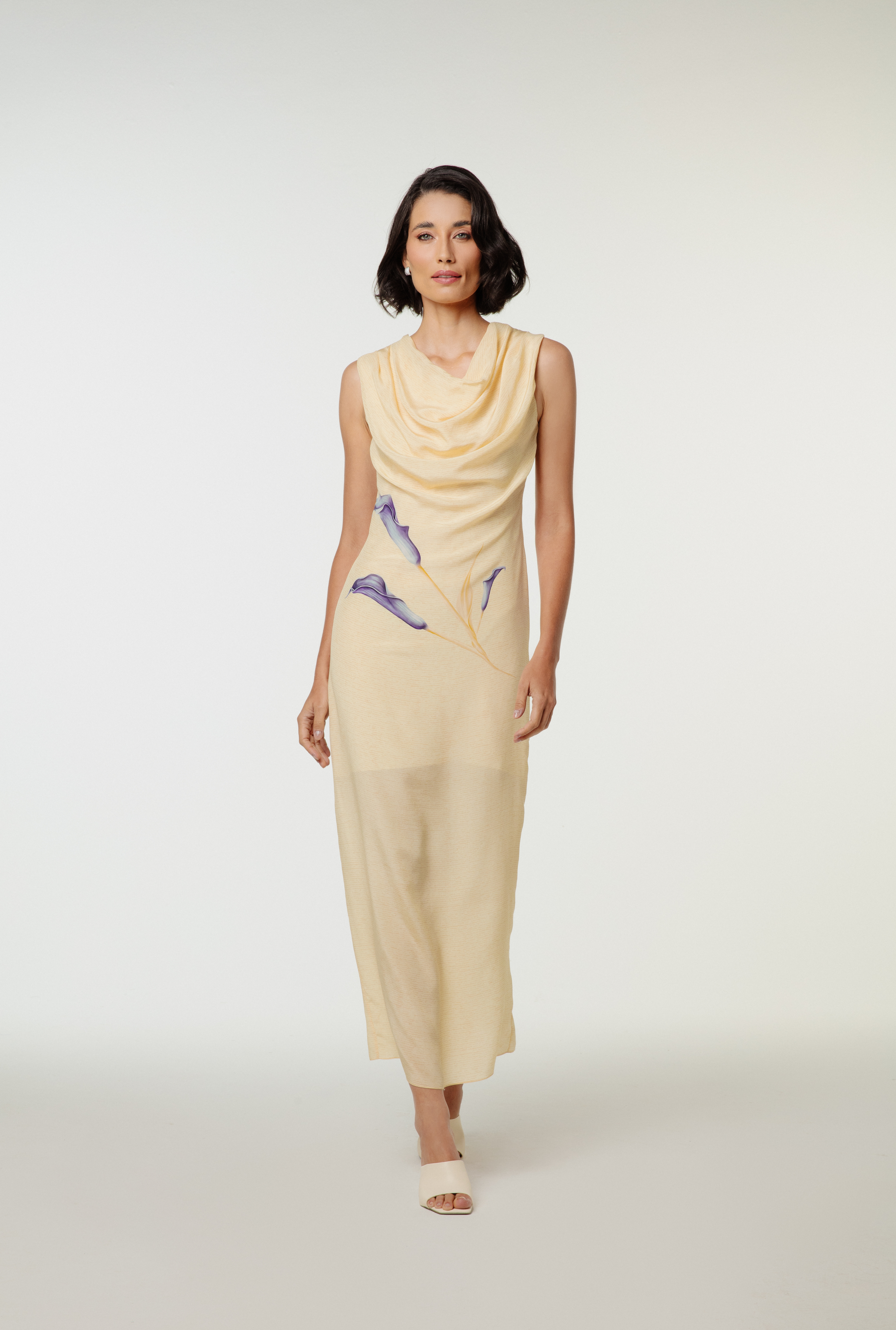 Um sofisticado bouquet de copos-de-leite adorna pontualmente esta peça que é fabricada em crepe de chine de seda. O Vestido Callas tem modelagem reta e conta com um volumoso decote degagé na frente. Seu fechamento é feito por delicados botões de madrepérola verdadeira ao longo das costas, dando um toque especial e elegante nos detalhes deste produto.