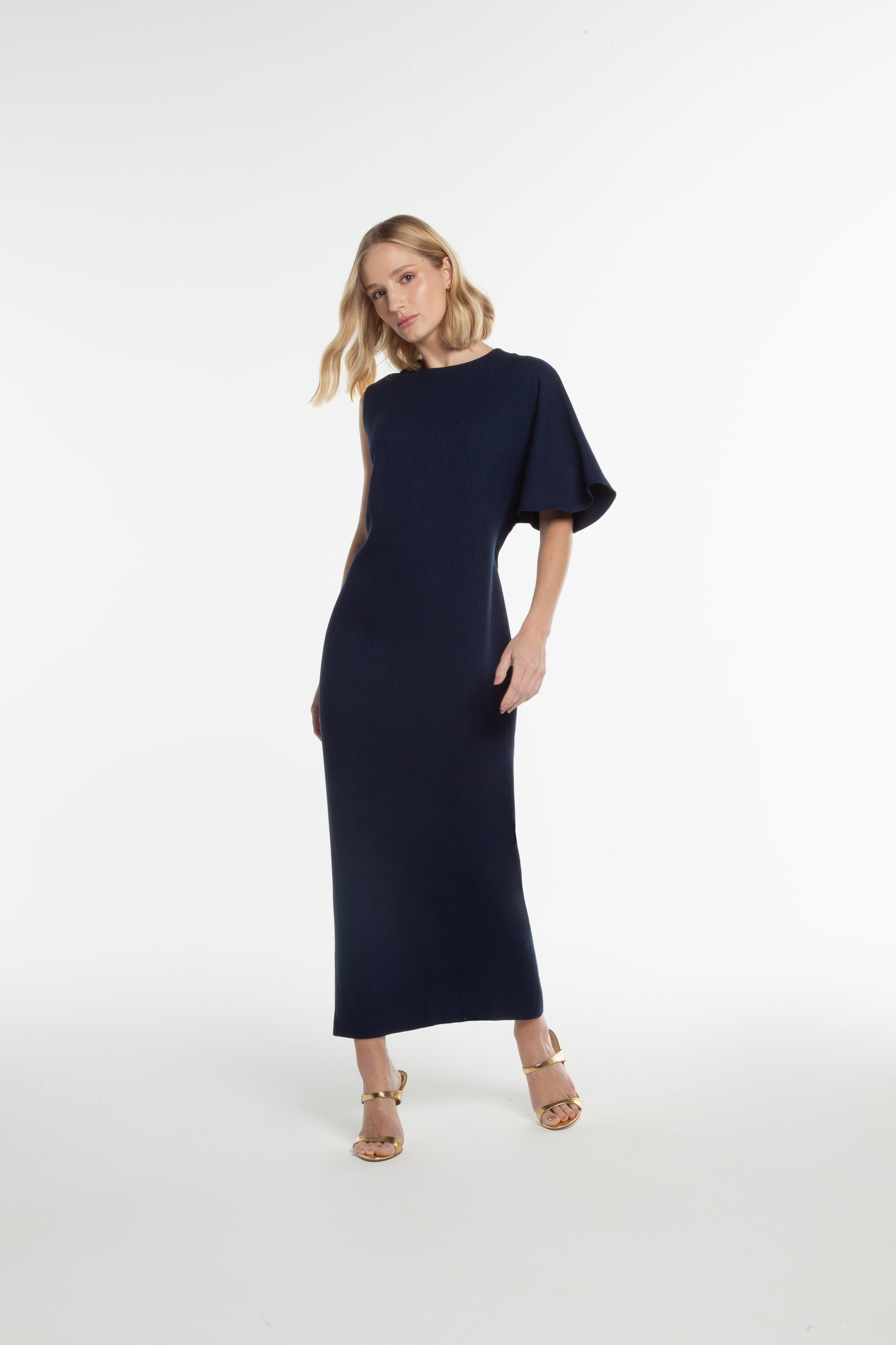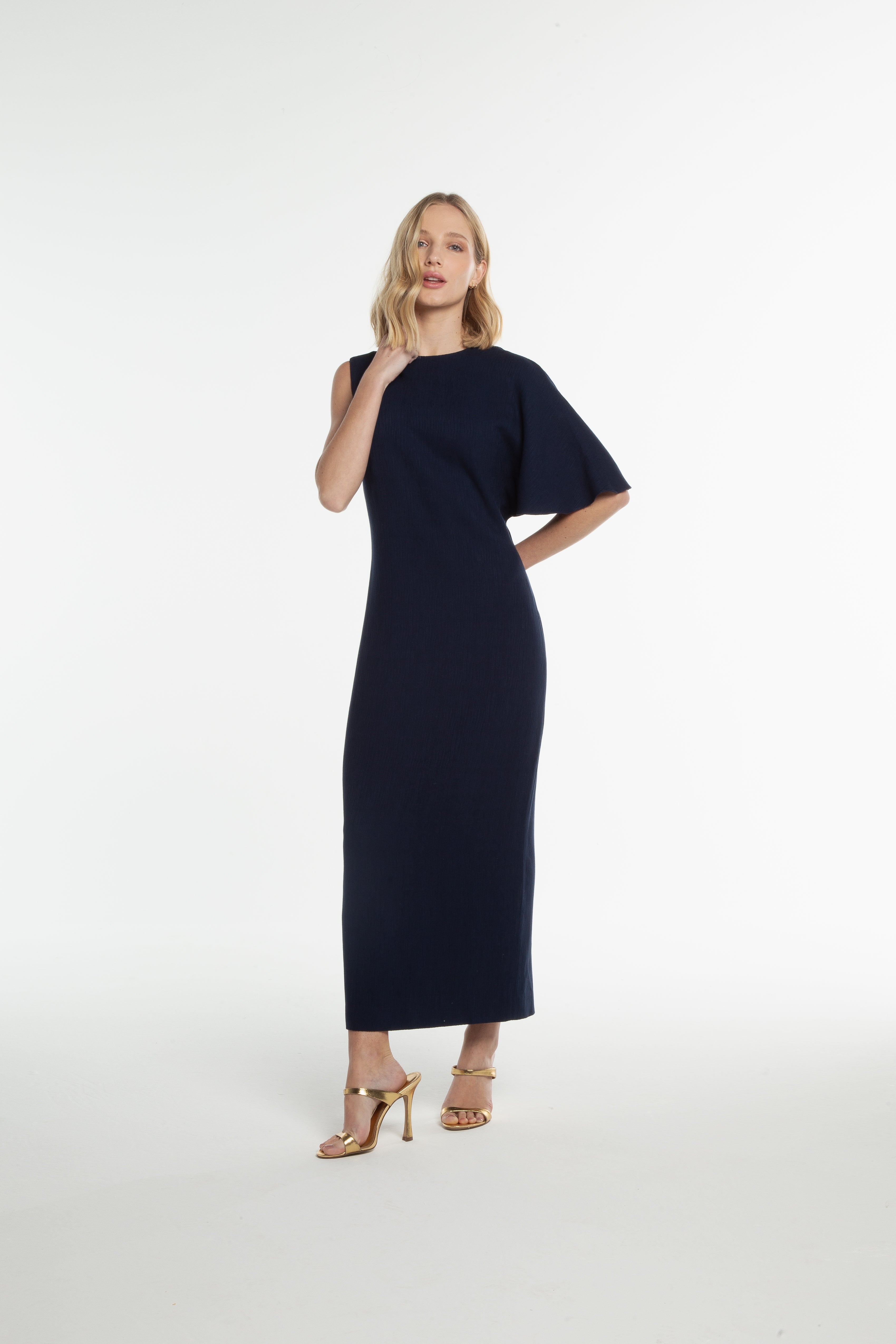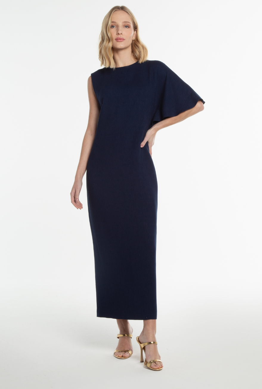 O Vestido Noturna é fabricado em tecido de viscose texturizada. A peça possui uma modelagem assimétrica, próxima do corpo e comprimento midi, formando uma silhueta alongada e elegante.