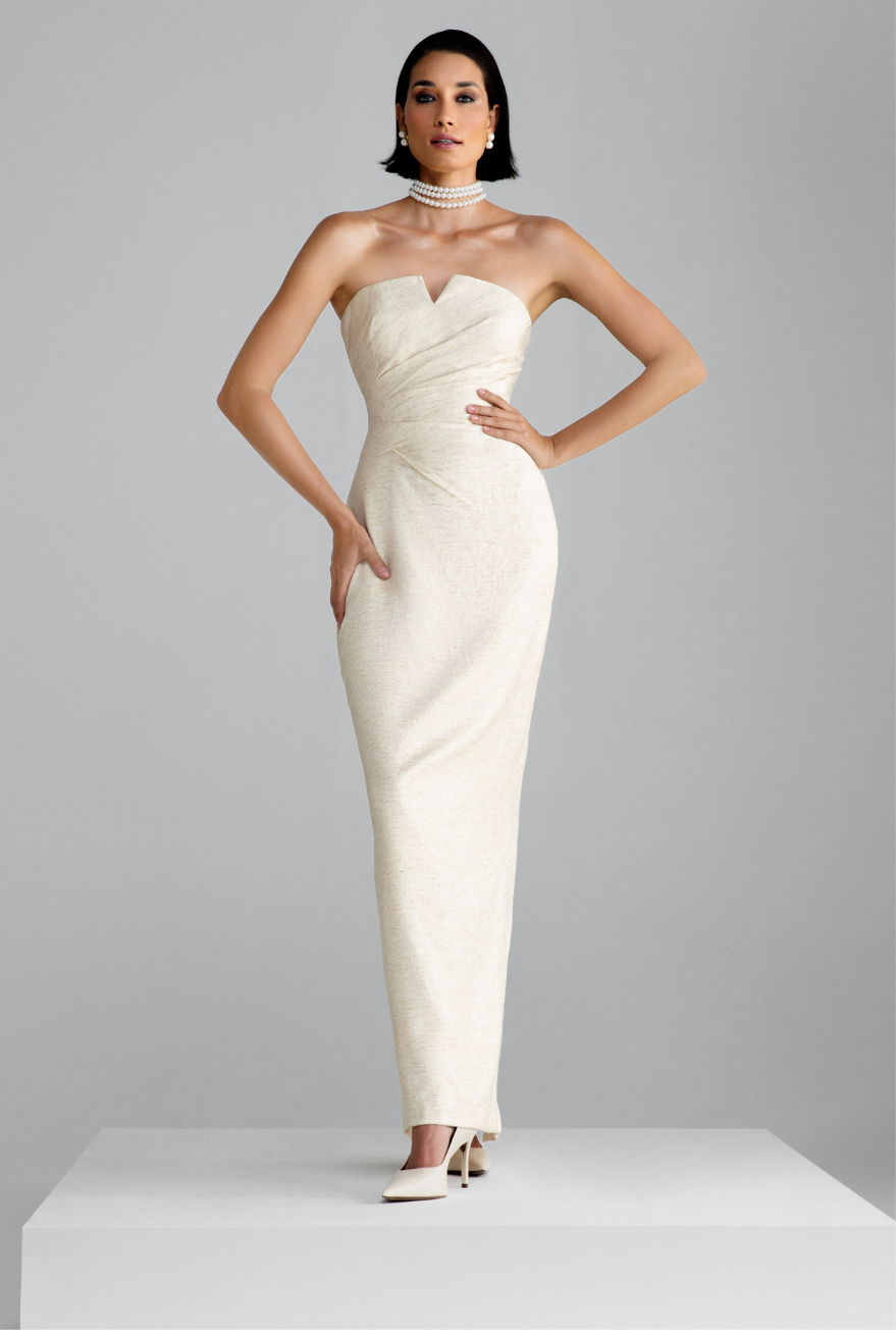 Icônico por natureza, o Vestido Pétalas é uma peça estruturada e de design escultural. É fabricada em tecido de jacquard importado com delicada padronagem de cashmeres e composto por fibras de cânhamo, viscose e linho. Sua modelagem é tomara que caia e possui pregas na lateral direita, fechamento por zíper e uma elegante fenda nas costas.