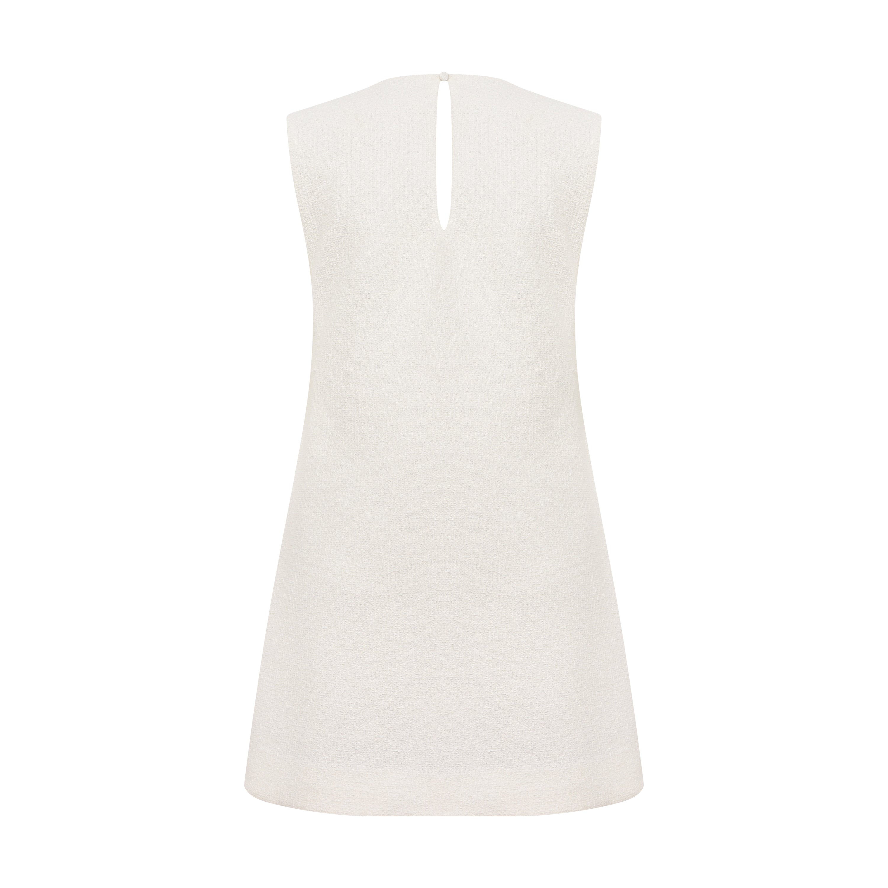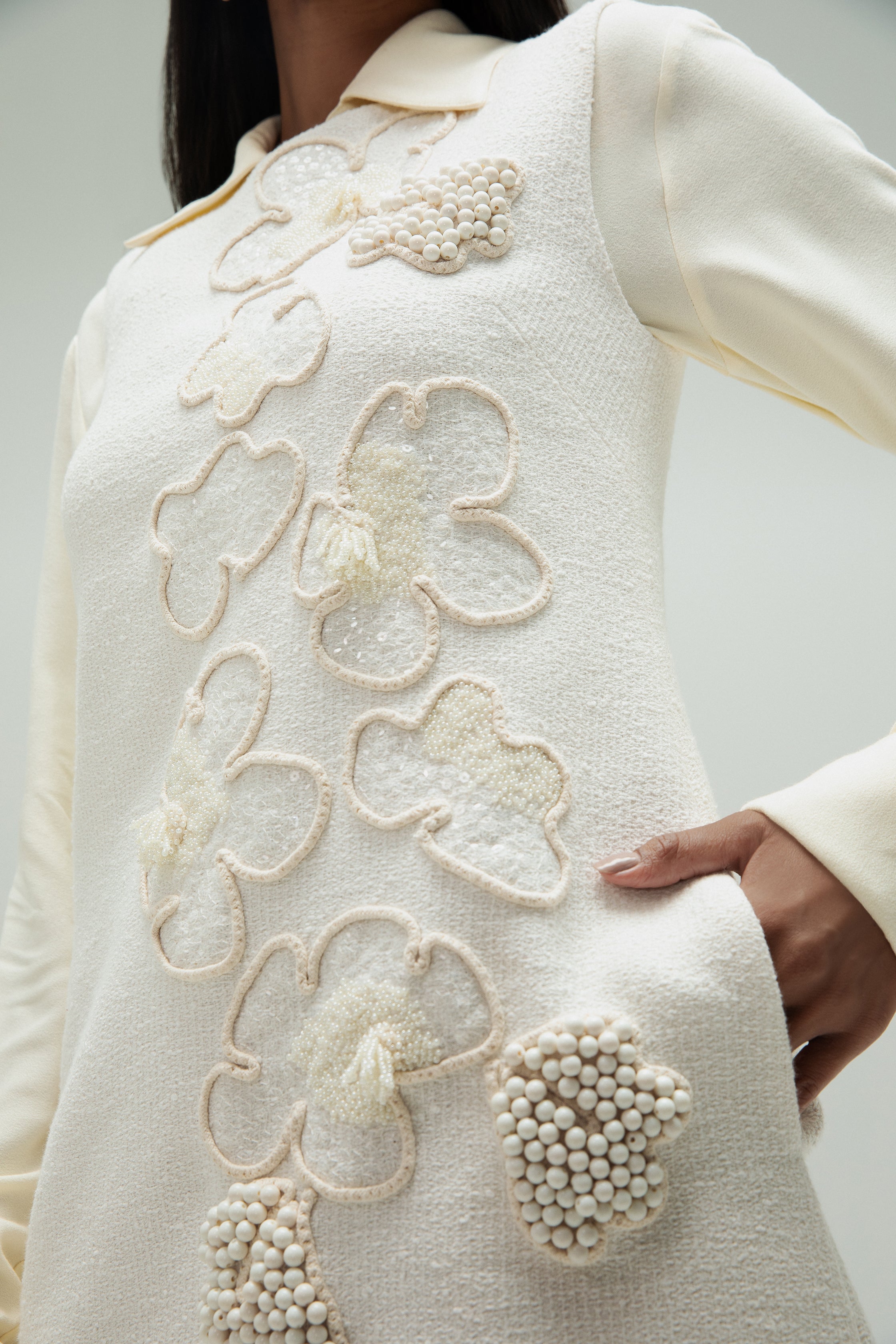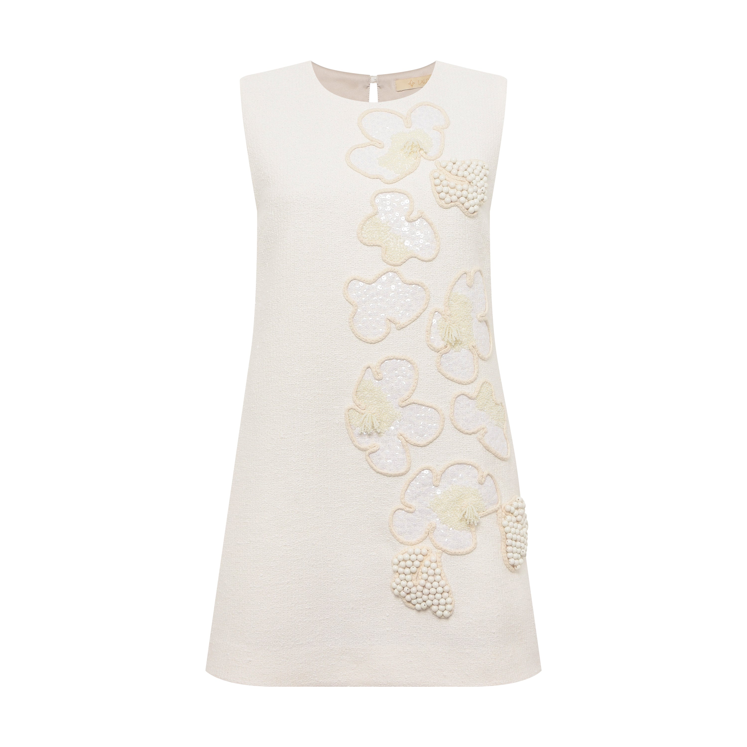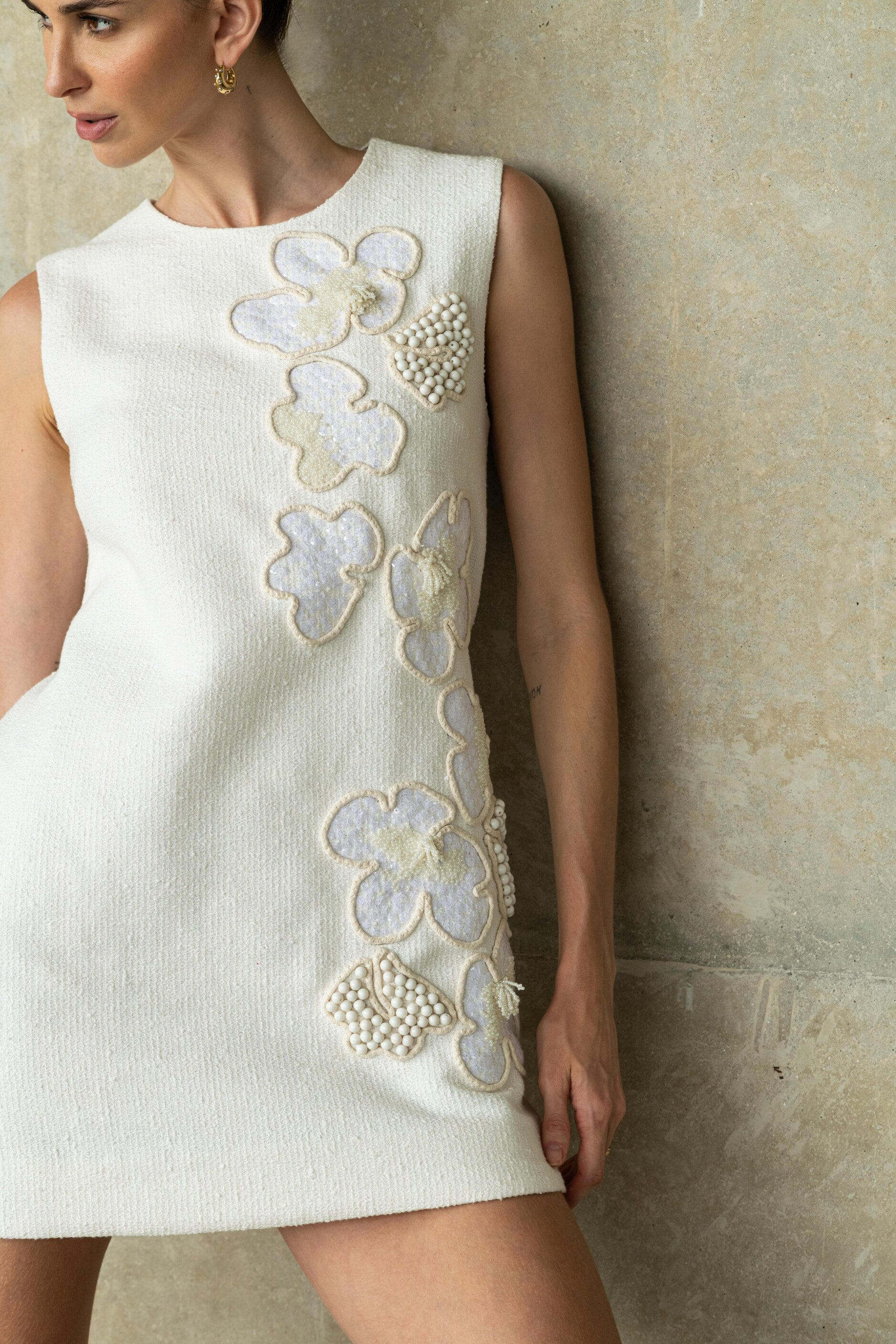 O vestido, de comprimento mini, é adornado por flores bordadas à mão.